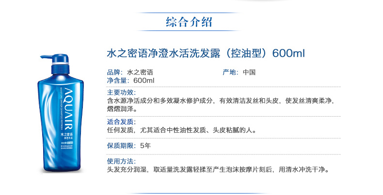 商品名称:资生堂 水之密语净澄水活洗发水/洗发露(控油型)600ml