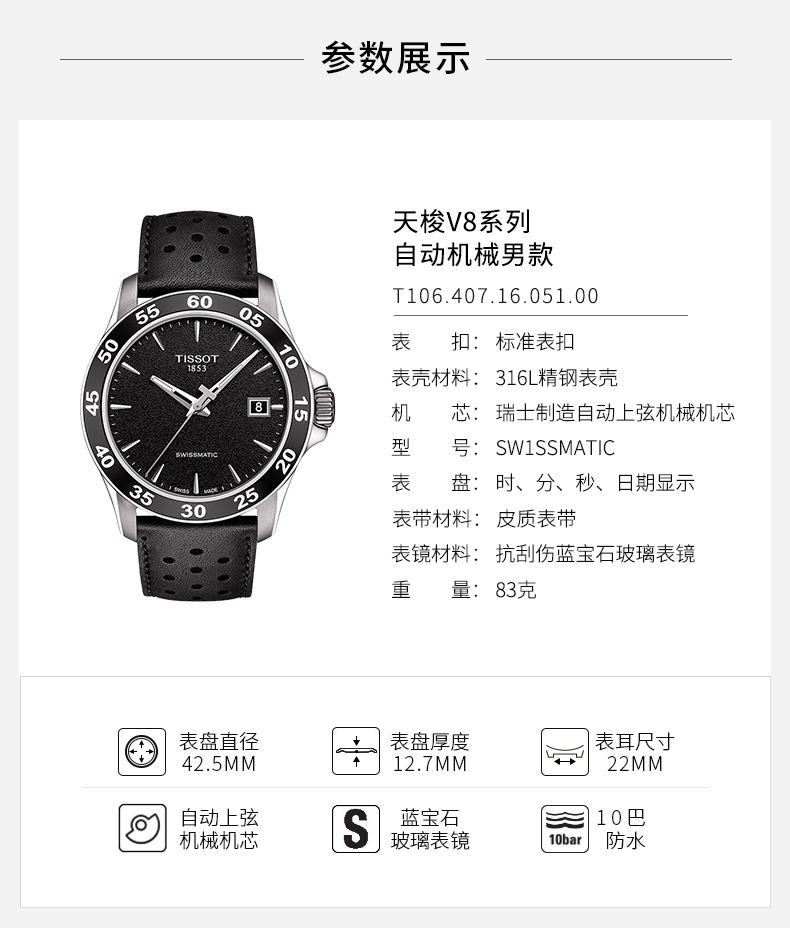 商品名称:Tissot天梭 V8运动休闲防水机械皮带男表
