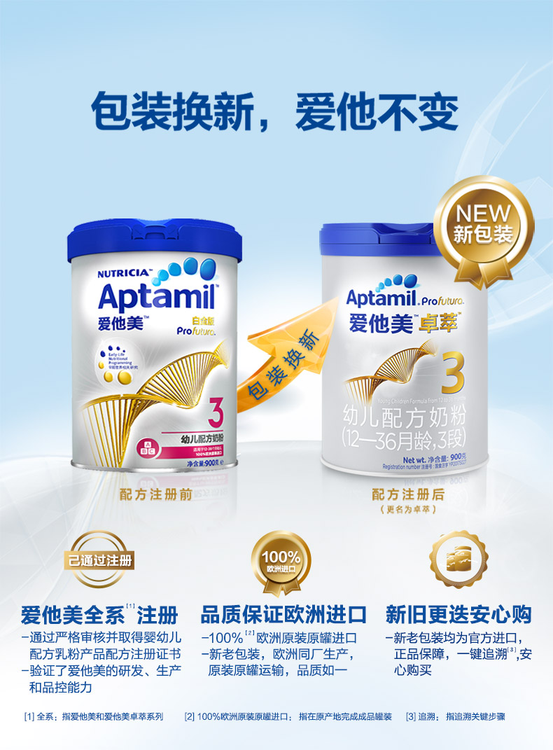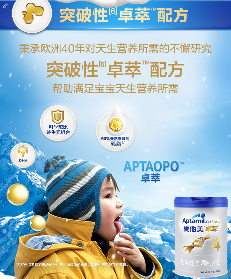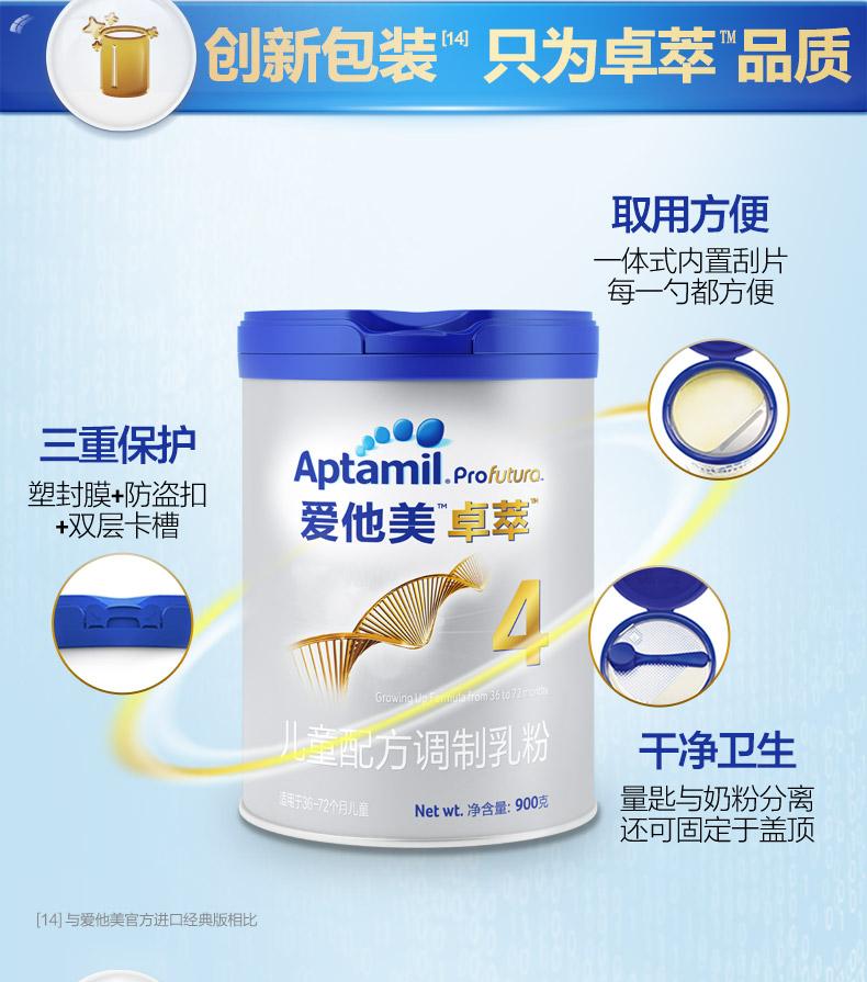 商品名称:爱他美/Aptamil 卓萃版 儿童配方奶粉4段900g(白金版)3-6岁牛奶粉
