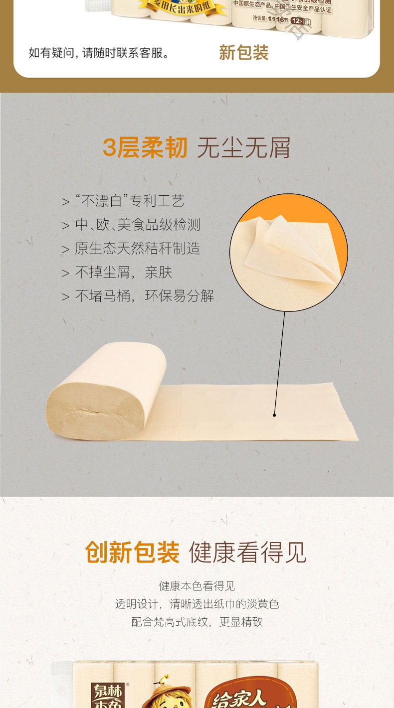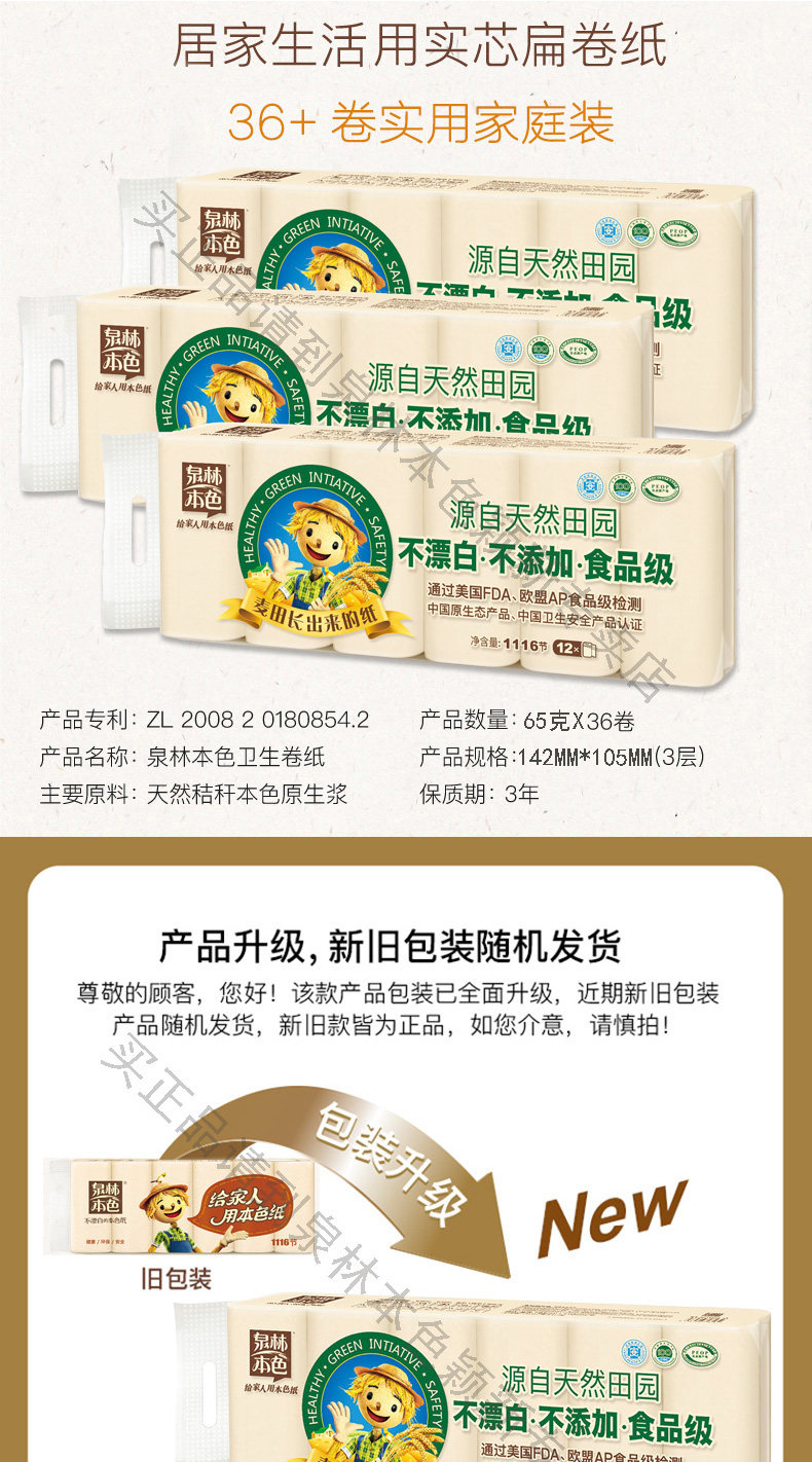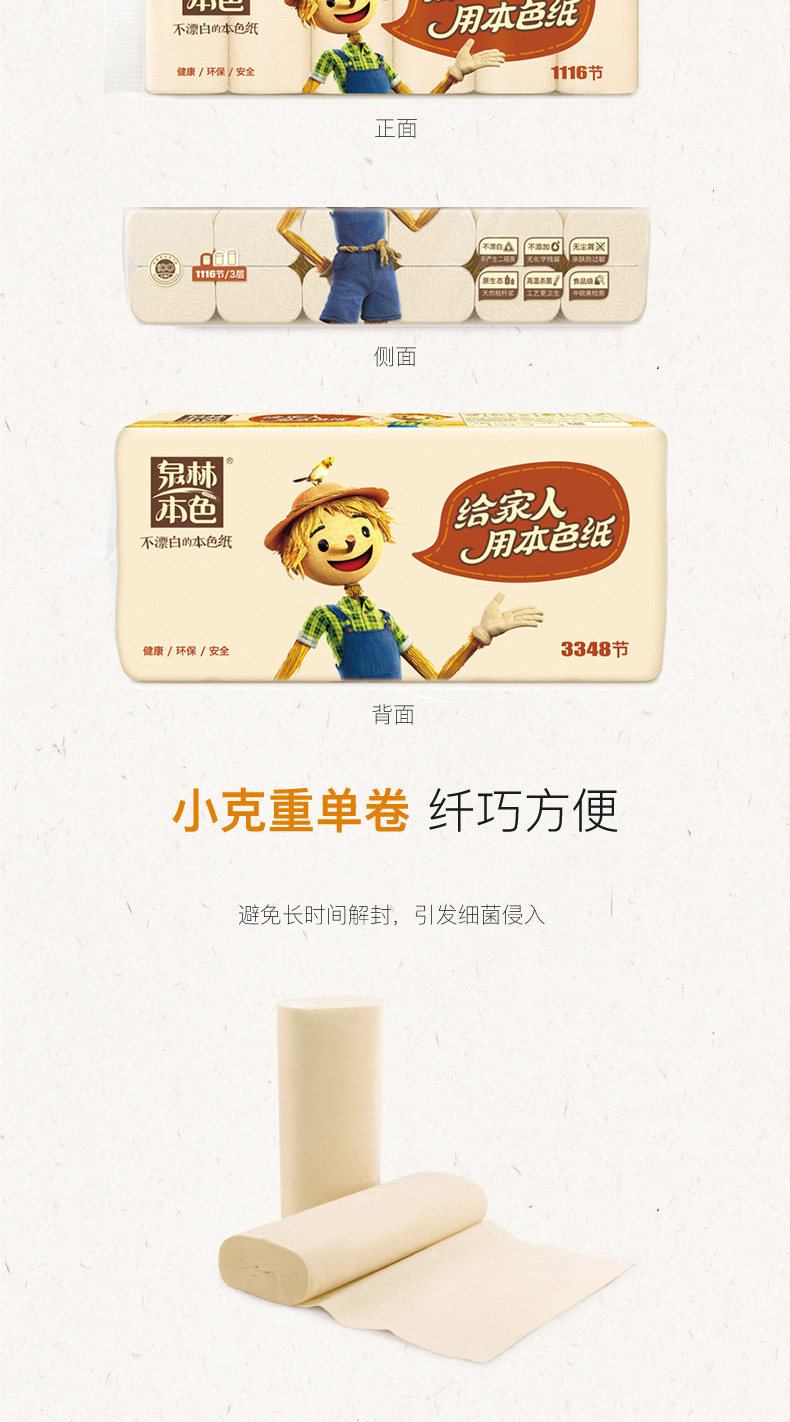 商品名称:泉林本色 卷纸家用 婴儿可用不漂白本色卫生纸纸巾3层卷筒纸36卷
