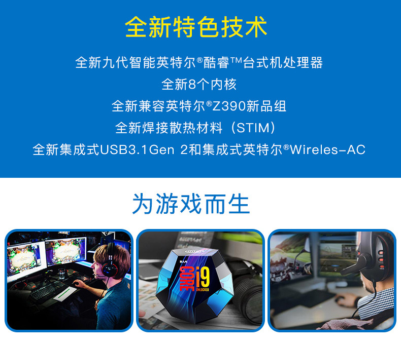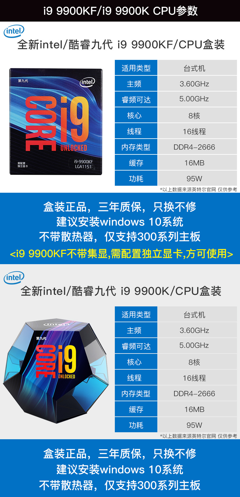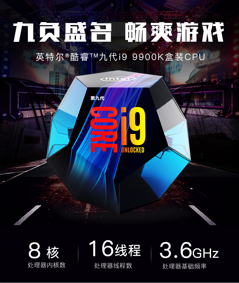 商品名称:Intel/英特尔 酷睿 i9 9900K 9900KF 台式机电脑CPU处理器盒装 8核16线程