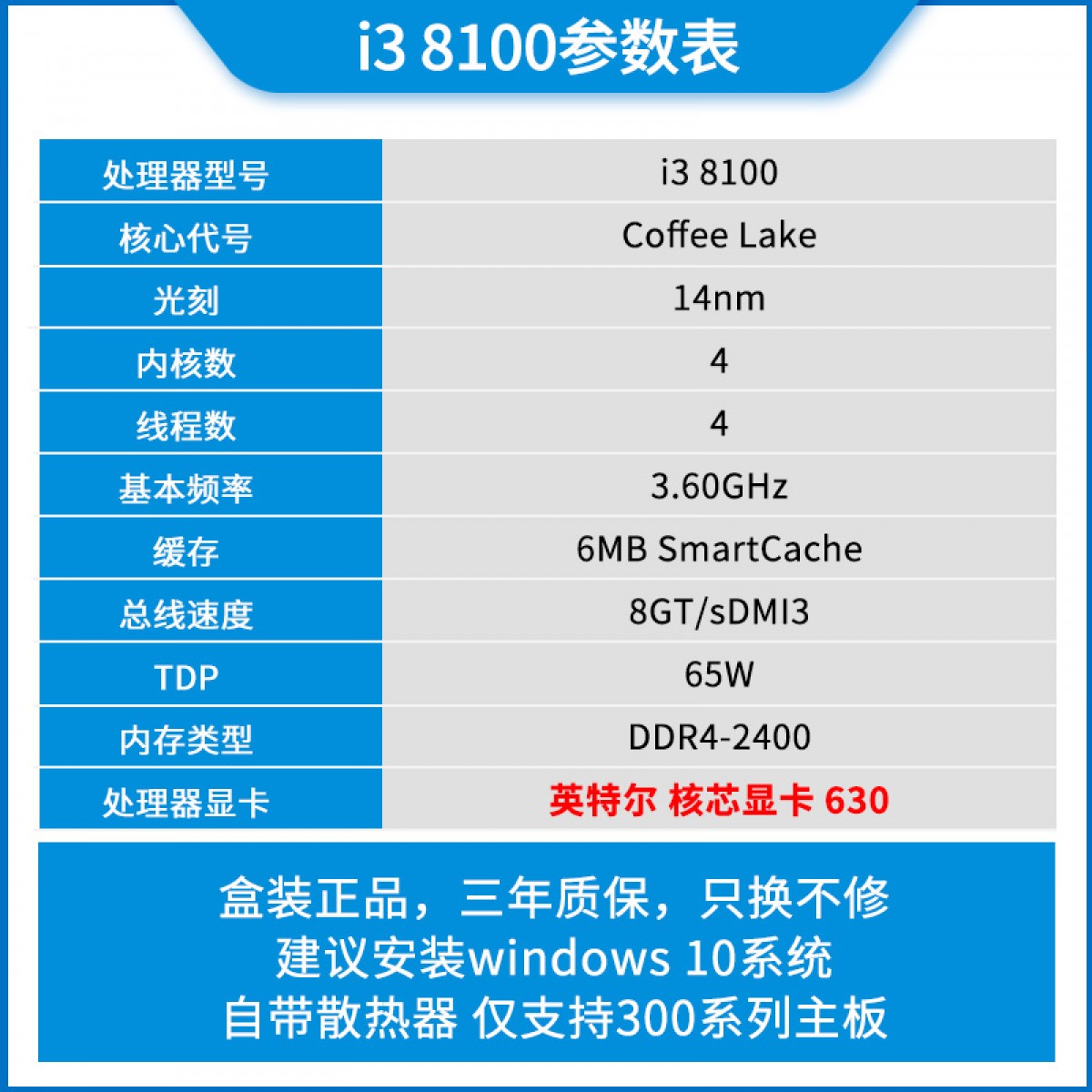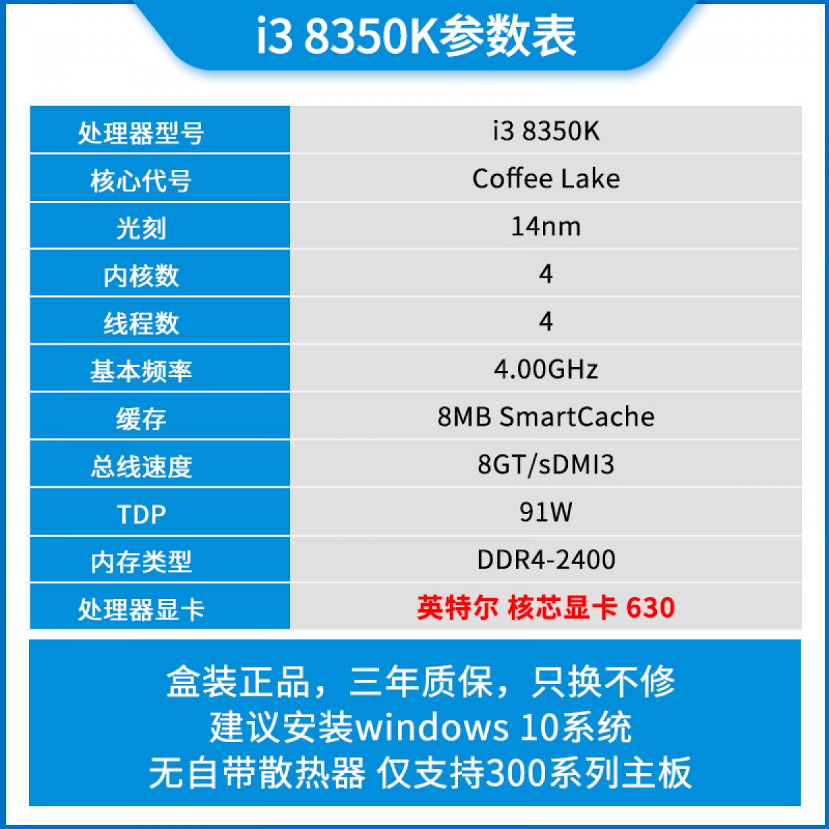 商品名称:Intel/英特尔 i3 8350K 台式机电脑cpu i3 8100 9100F盒装1151针处理器
