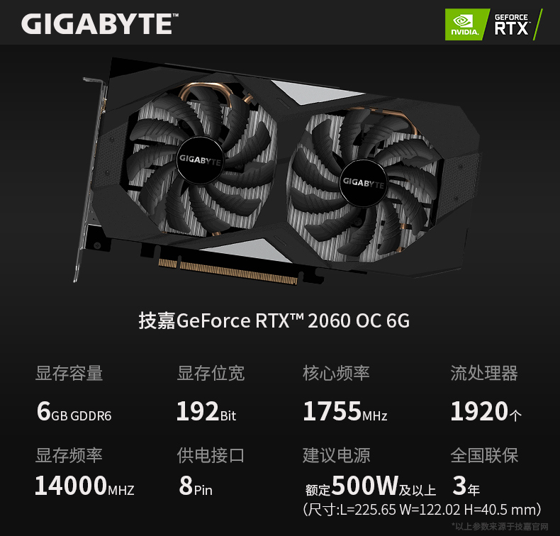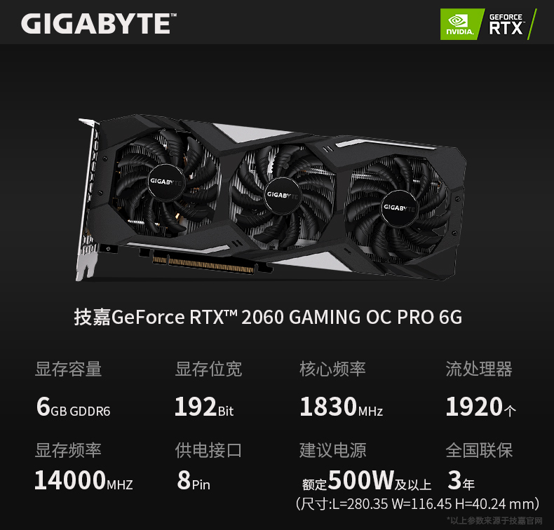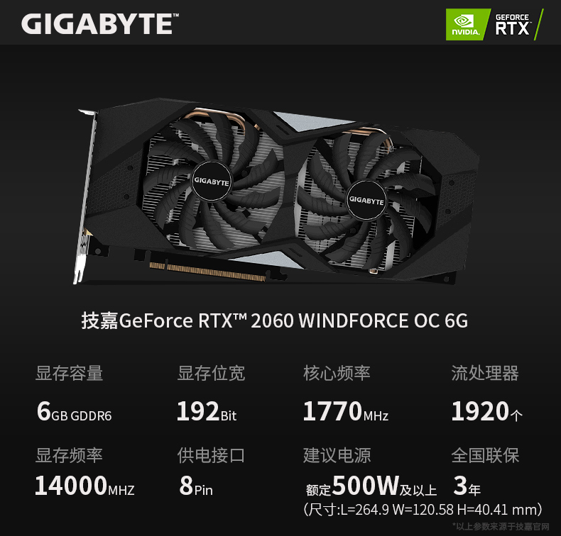 商品名称:技嘉 RTX2060 6G WF/GAMING OC电脑显卡台式机吃鸡游戏独立显卡
