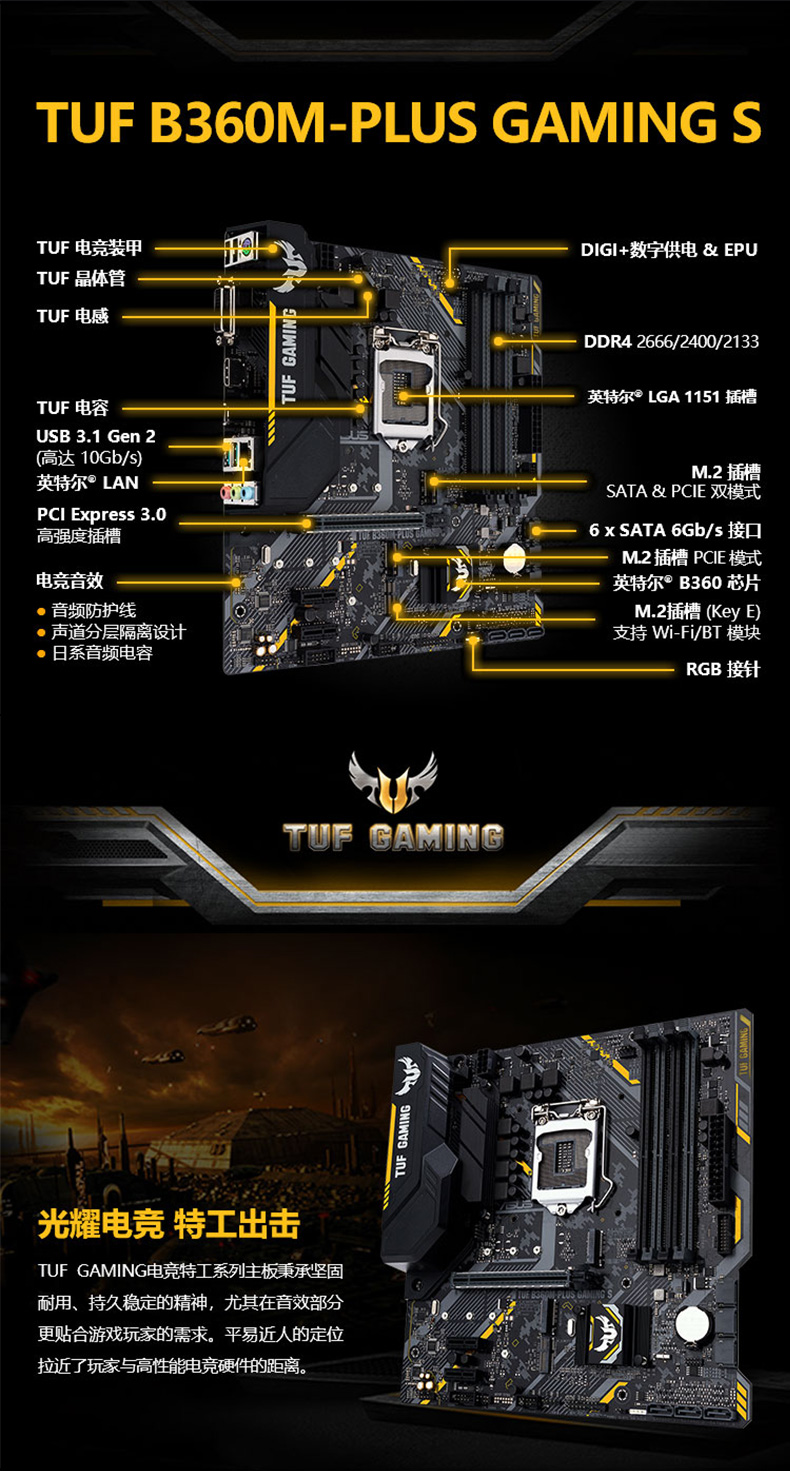 华硕 S电脑台式游戏主板1151针 b360M小板 支持九代9400F英特尔处理器 TUF B360M-PLUS GAMING