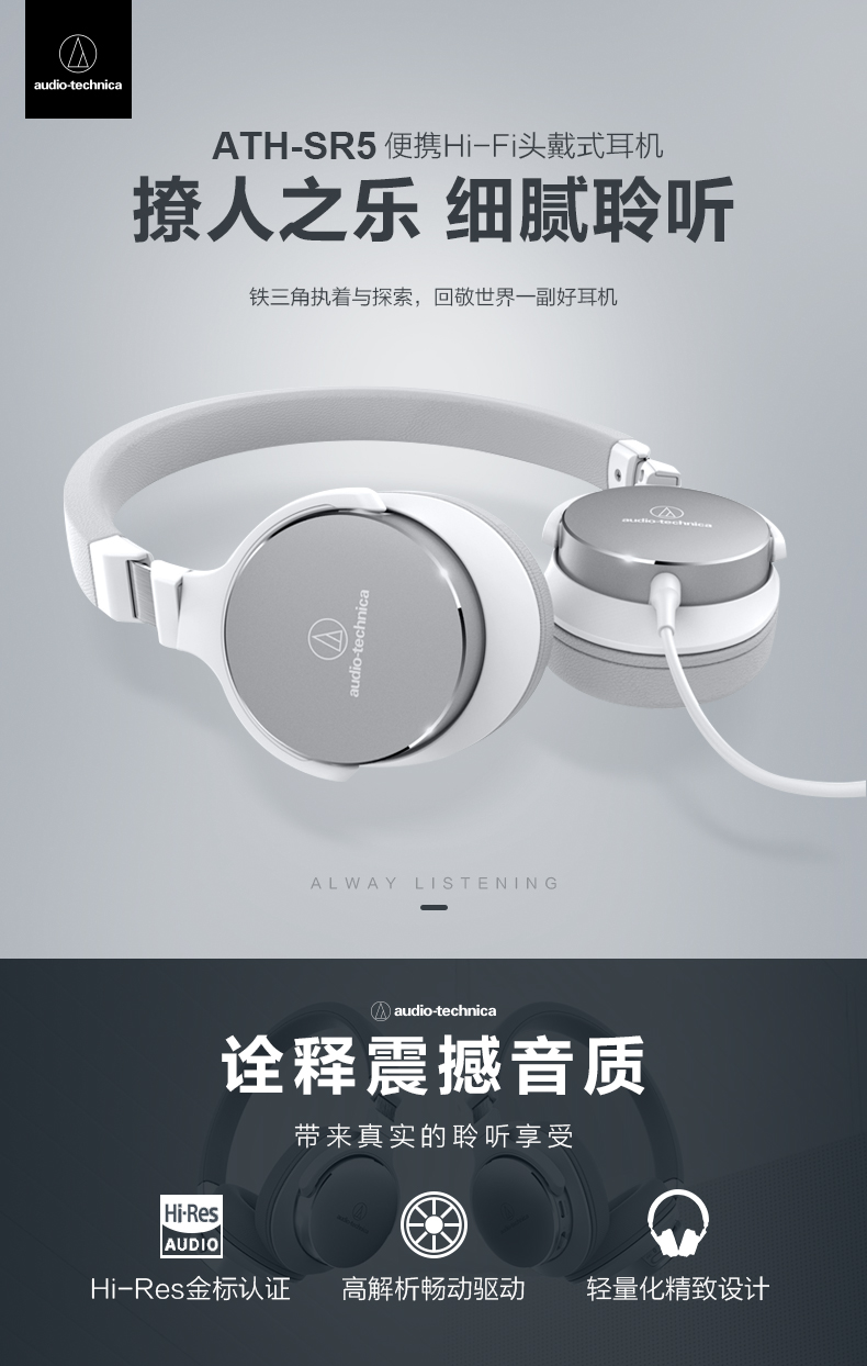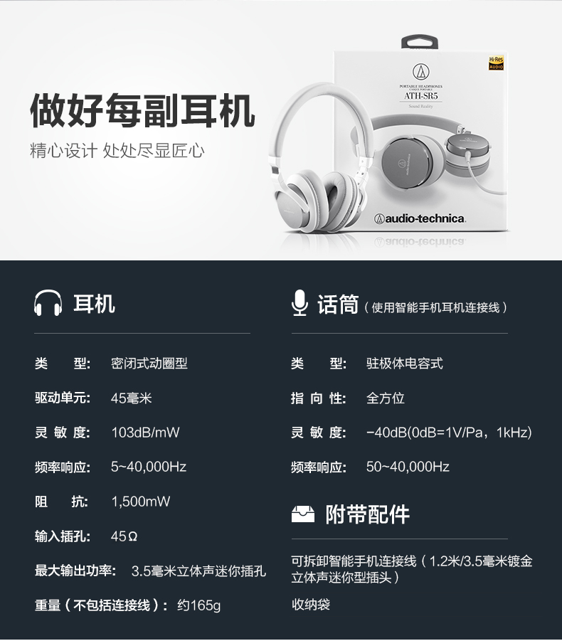商品名称:铁三角/Audio Technica 便携HIFI头戴式耳机 ATH-SR5