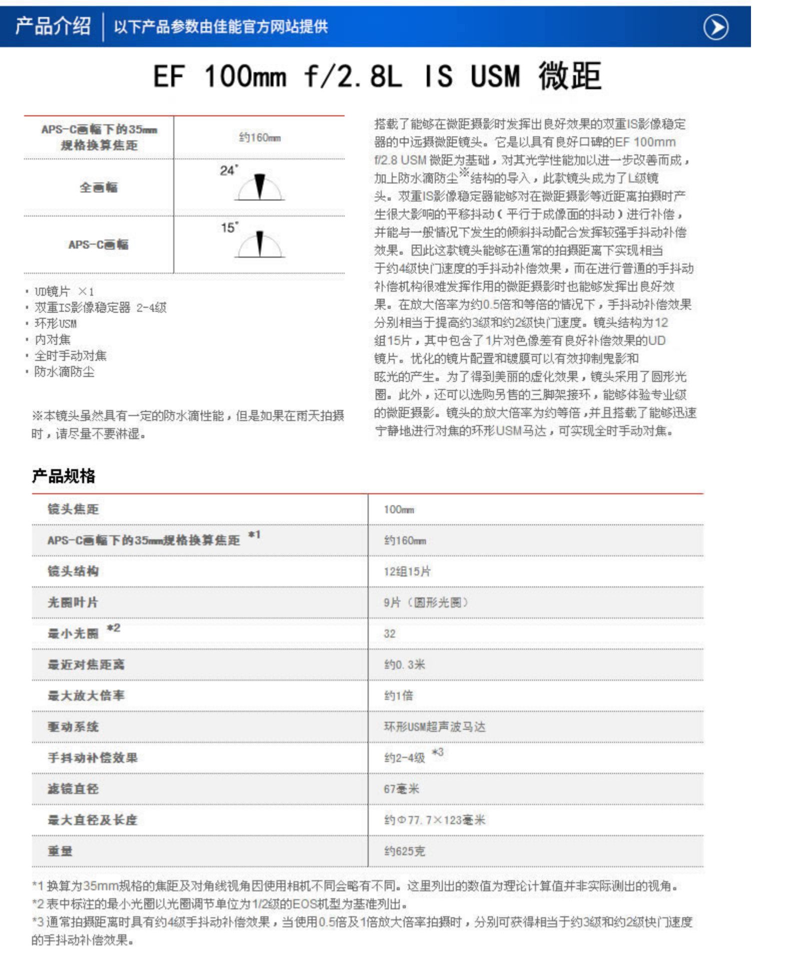 商品名称:佳能 微距单反镜头 新百微 红圈镜头 EF 100mm F2.8L IS USM