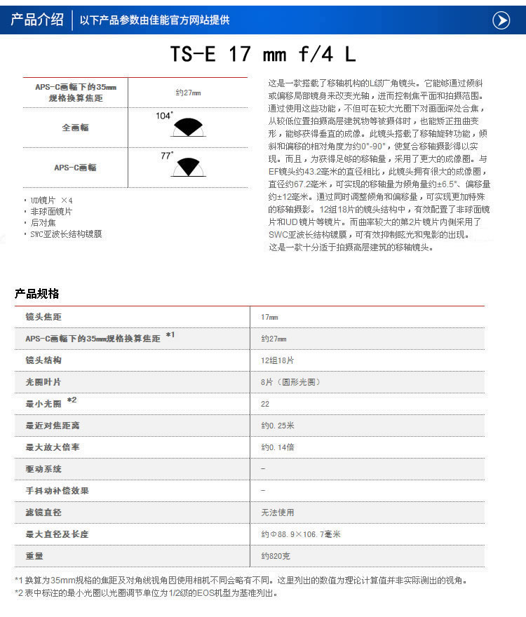 商品名称:佳能 17 F4 移轴红圈镜头 建筑 风景 TS-E 17mm f/4L