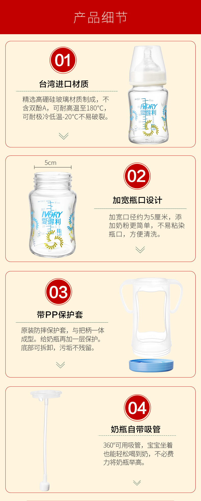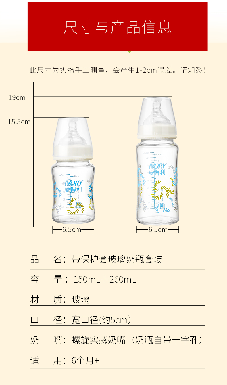 商品名称:爱得利 玻璃奶瓶宽口径高硼硅奶瓶新生儿带吸管防摔保护套装WG-16