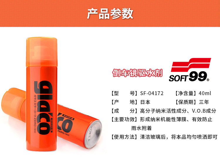 商品名称:SOFT99 倒车镜驱水剂玻璃水雨敌 后视镜驱水防雨剂 镀膜型 SF-04172 40ml
