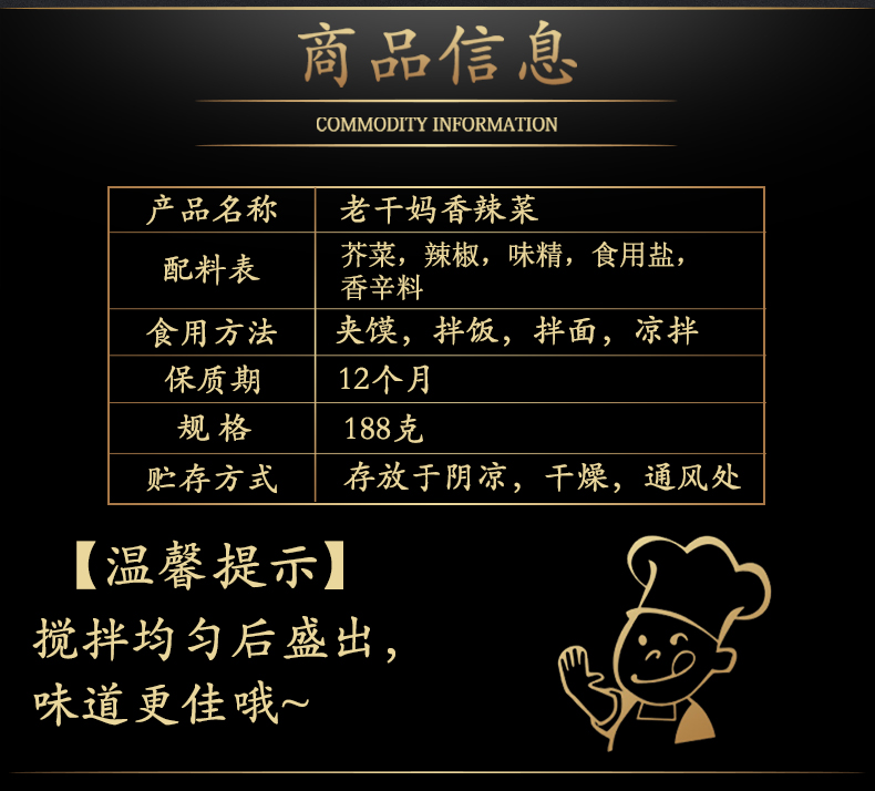 商品名称:老干妈 香辣菜188g/瓶装