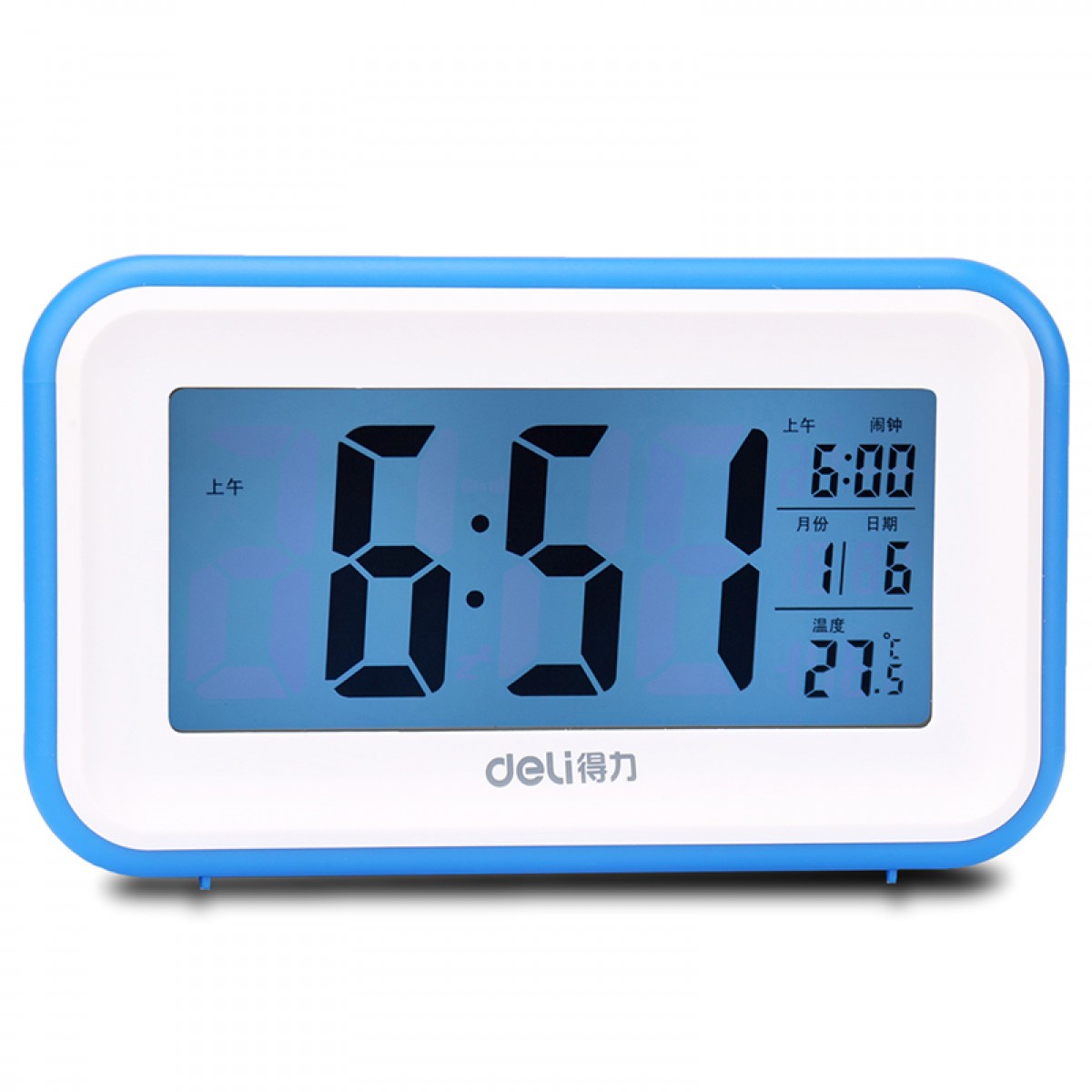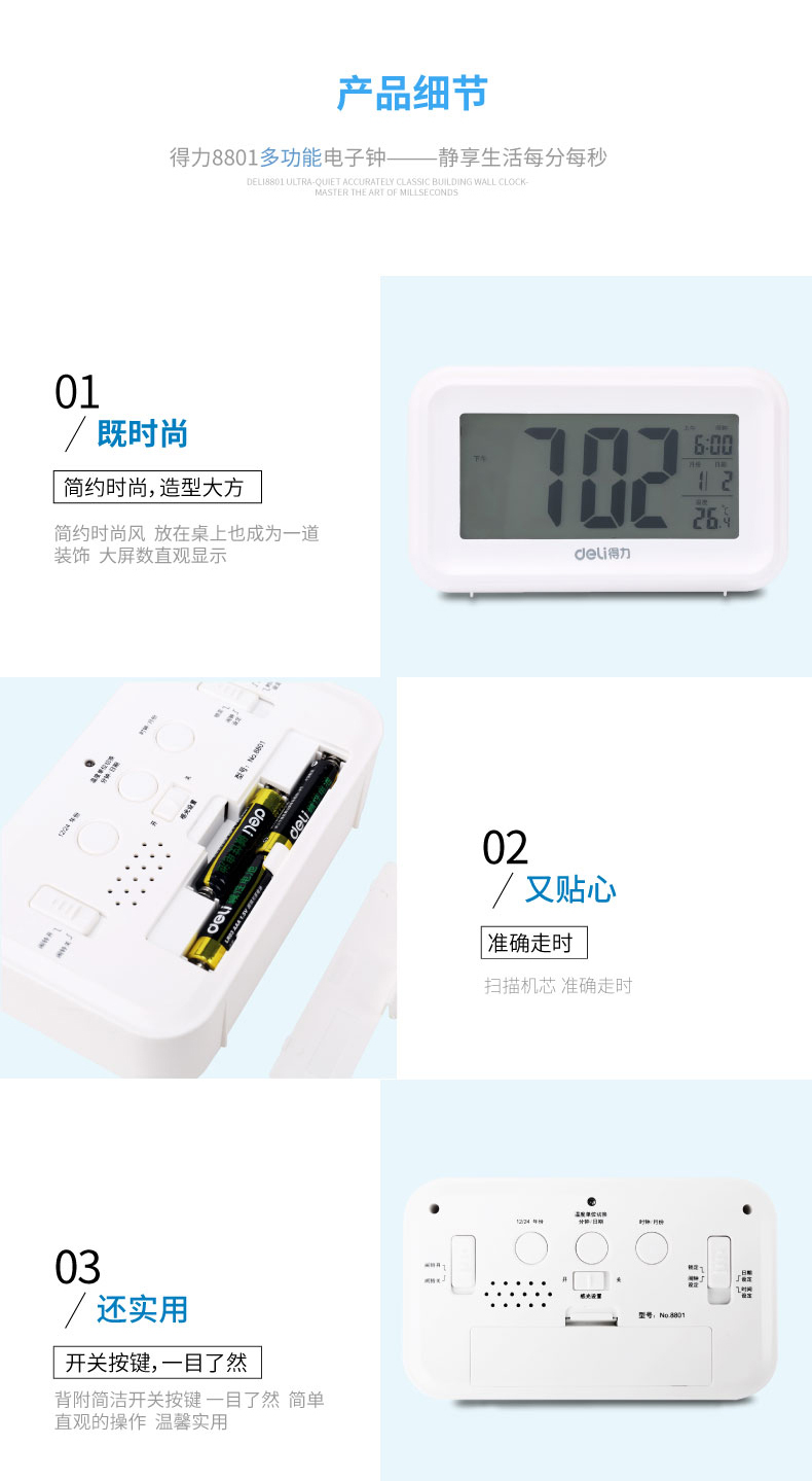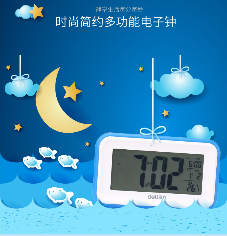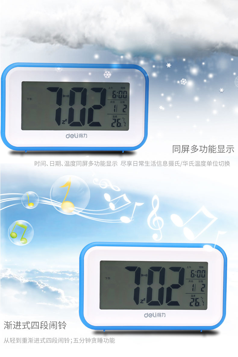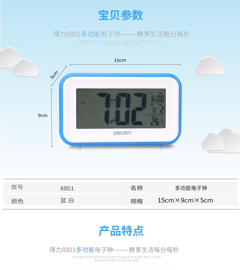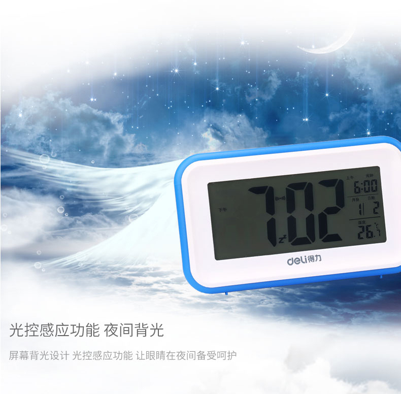 商品名称:得力 8801多功能电子钟触摸光控感应夜光懒人贪睡闹钟创意床头闹钟