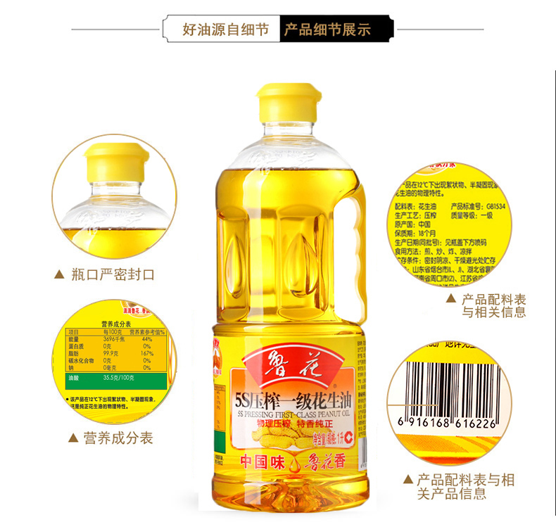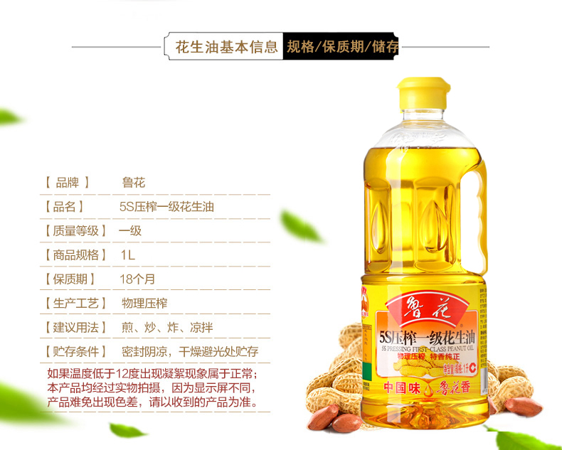 商品名称:鲁花 食用油 5S 物理压榨 压榨一级 花生油1L