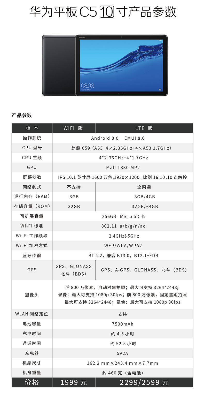 商品名称:★ 华为/Huawei 平板 10.1英寸 WiFi版3G+32G C5