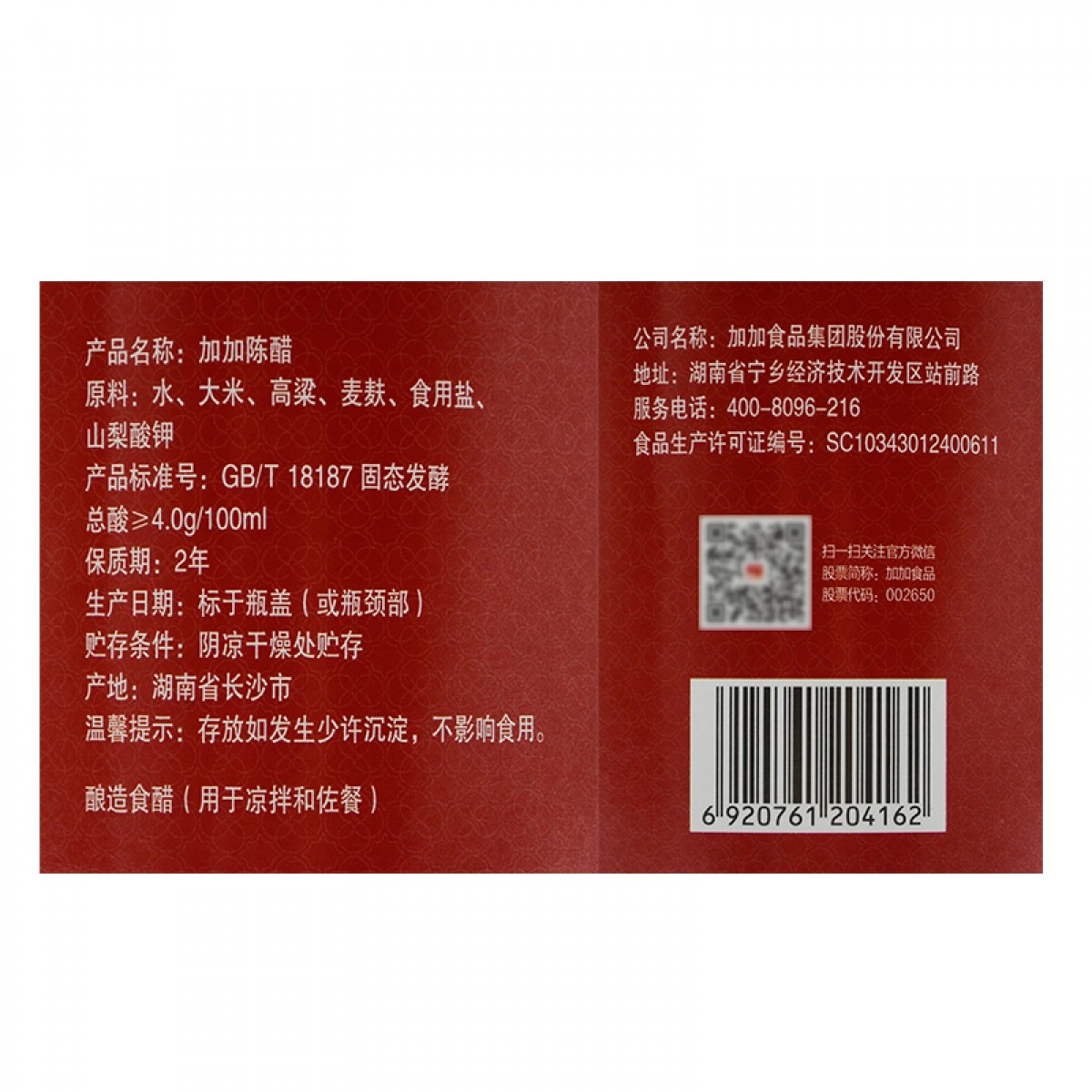 商品名称:加加 陈醋1900ml食醋