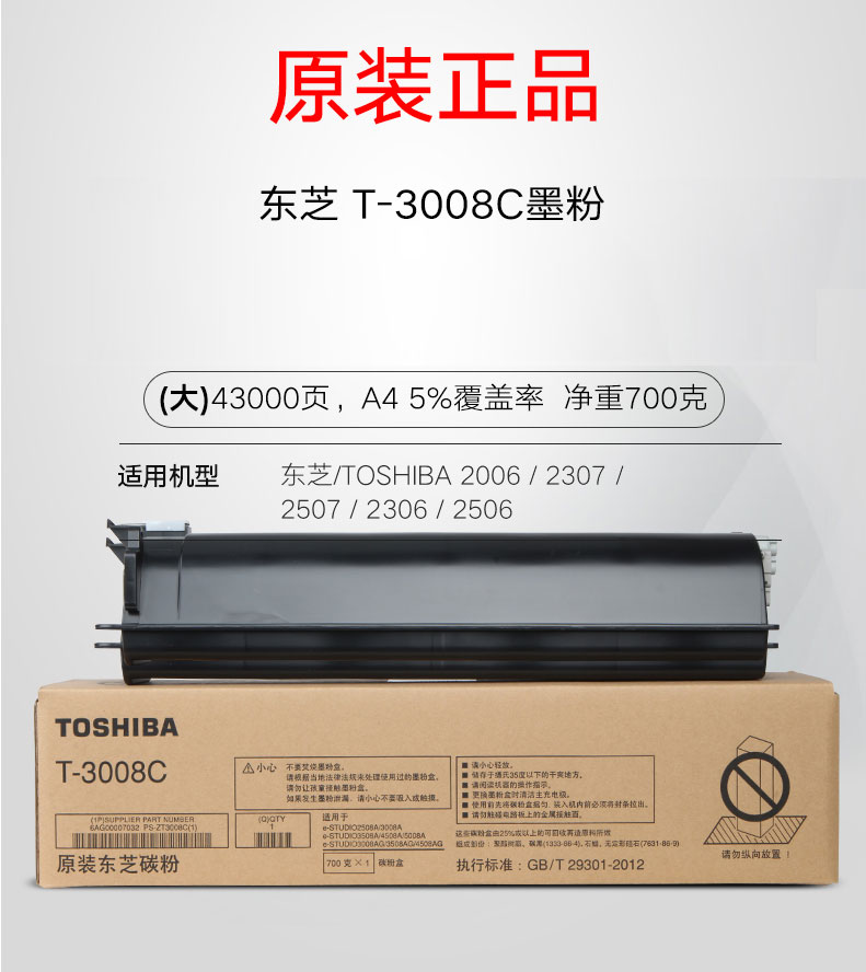 商品名称:★ 东芝/Toshiba 复印机黑色碳粉盒 T-3008C 高容 700g 适用于东芝E2508A/3008A/3508A/4508A/5008A/3008AG/3508AG/4508AG 打印量43000页