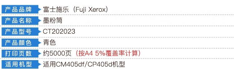 商品名称:富士施乐(Fuji Xerox) CT202023 青色打印机原装碳粉 适用CP405d/CM405df 打印量5000页