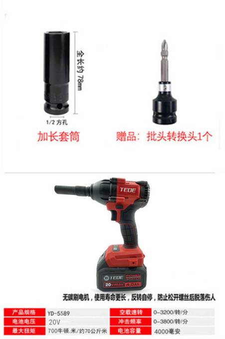 商品名称:TEDE YD-5589 无刷充电式锂电电动扳手1/2英寸16件组套(两电一充)(计价单位:套)