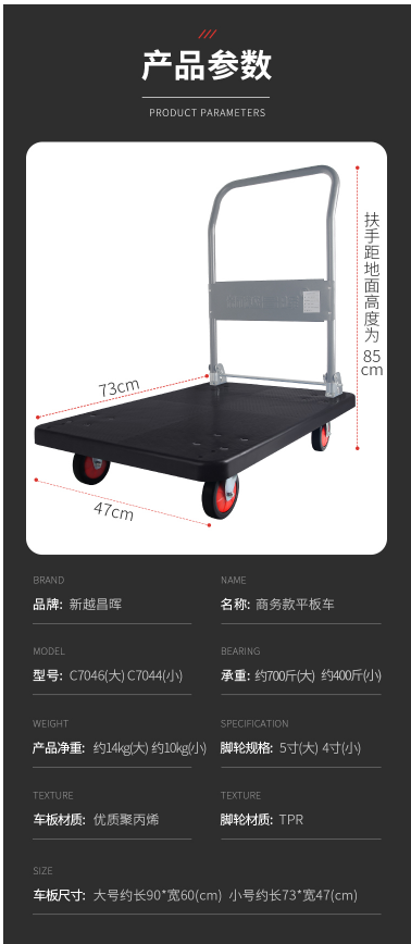 商品名称:新越昌晖 平板车小推车货车静音搬运车手推车小拖车货73*47承重约300斤护角防撞C7044