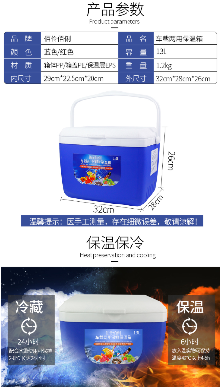商品名称:佰伶佰俐 车载保温箱冷藏箱家用野餐烧烤户外钓鱼冷热两用便携汽车保鲜箱 买一赠十 13升蓝色