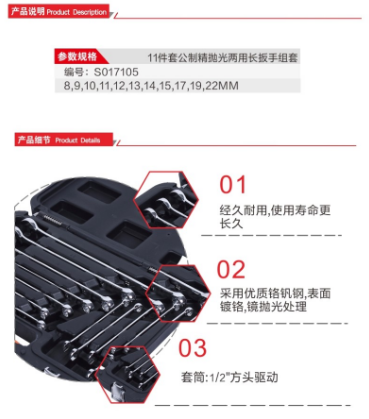 商品名称:钢盾 SHEFFIELD S017105 公制精抛光两用长板手(塑盒)十一件套