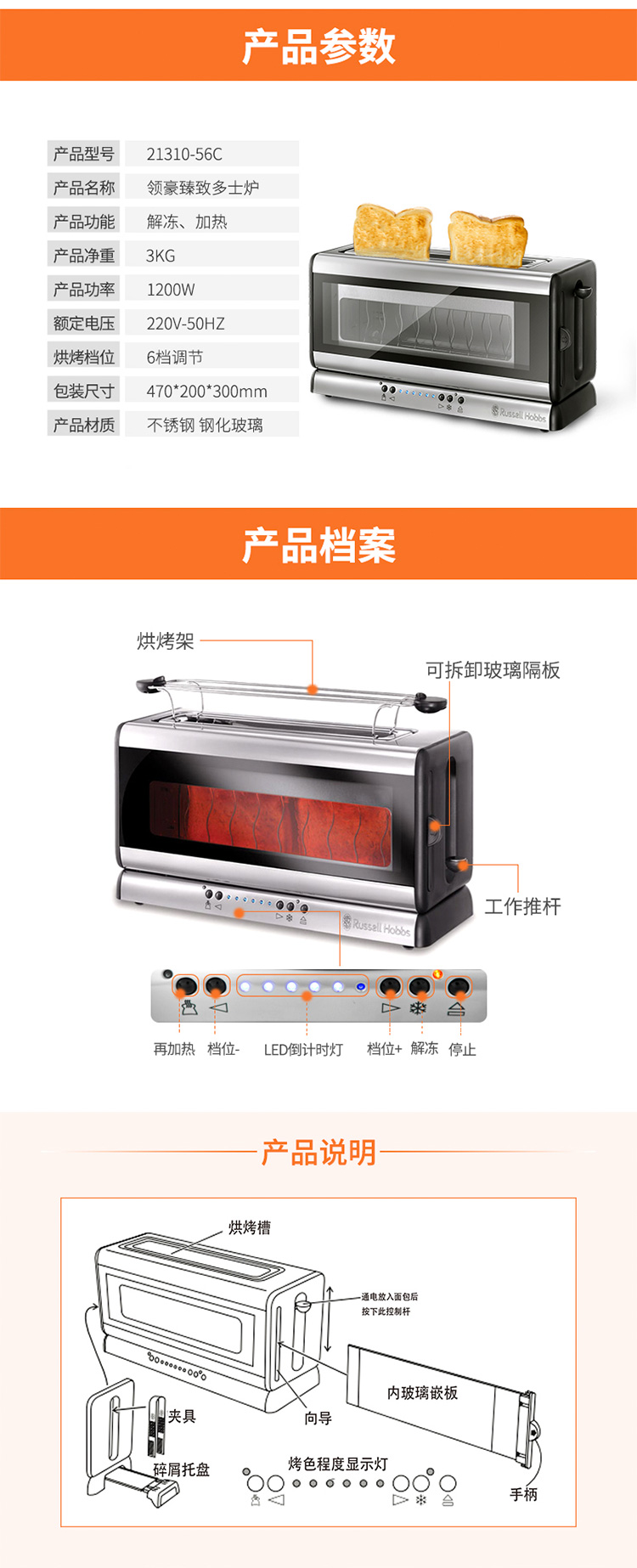 商品名称:领豪 RUSSELL HOBBS 臻致多士炉 面包机 吐司机 烤面包机 家用 全自动早餐烤面包机