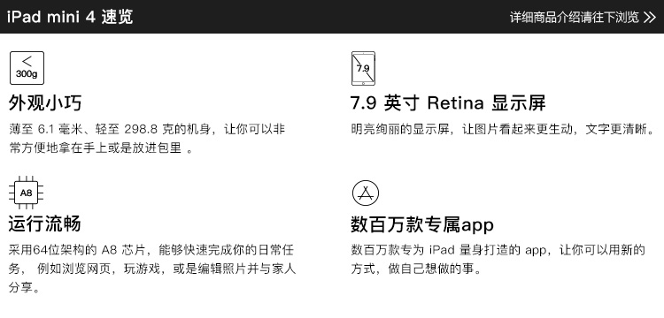 商品名称:APPLE IPAD MINI 4 7.9英寸 平板电脑(128G WLAN+CELLULAR版8芯片/RETINA显示屏 MK762CH)深空灰色