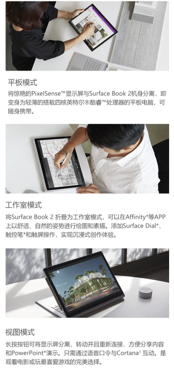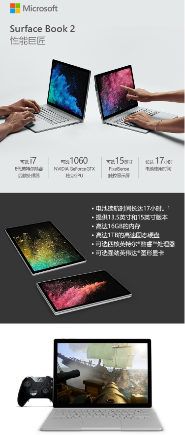 微软 MICROSOFT SURFACE BOOK 2 13.5英寸(INTEL I7 16G内存 1T存储)银色 平板电脑