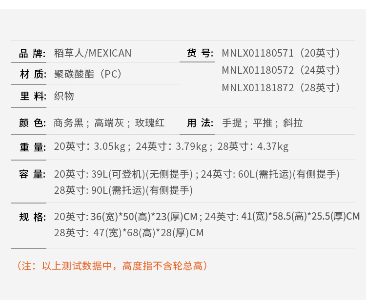 商品名称:稻草人 MEXICAN 拉杆箱 拉链 PC 万向轮 双杆 24英寸 商务黑