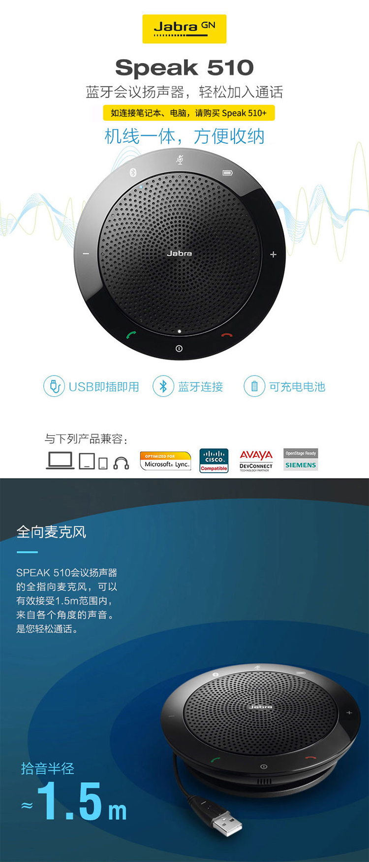商品名称:☆捷波朗 JABRA SPEAK410MS 视频会议麦克风/扬声器