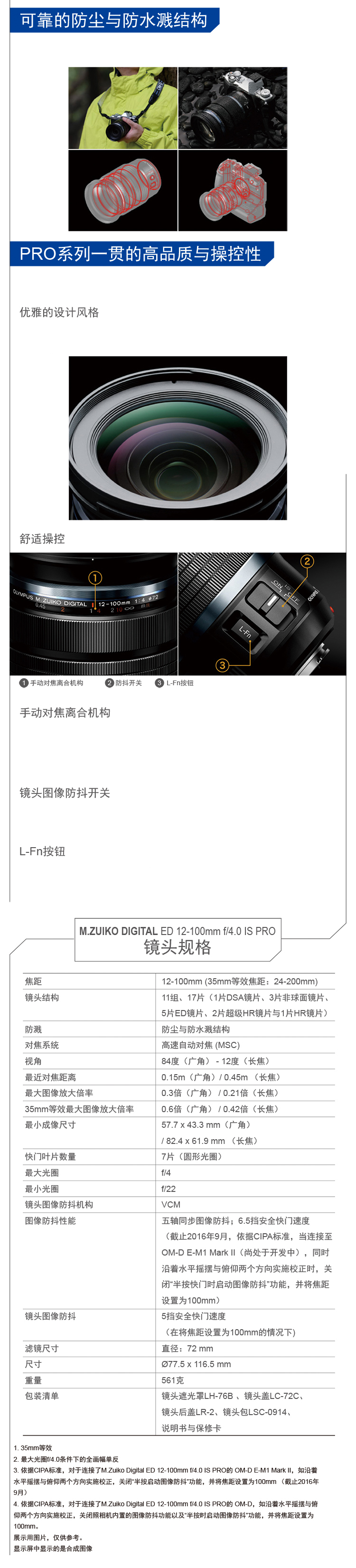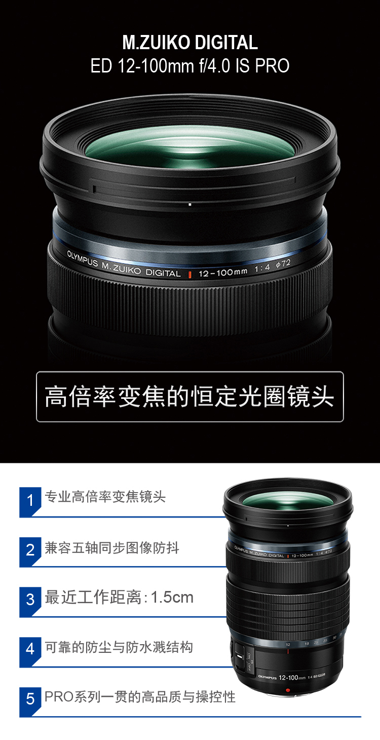 ![]() M.Zuiko ED 12-100mm f/4.0 IS PRO是一款结构紧凑的变焦镜头,兼顾优良的成像效果以及高倍率变焦,可满足专业摄影人员的需求。 该镜头可在整个变焦范围内,即从广角端的24mm[1]到长焦端的200mm[1],向专业摄影人员提供出众的画质。在性能上,是两个同类竞争产品[2] 之和。此外,该镜头方便携带,可用于广角拍摄、远距离拍摄、微距摄影、夜景拍摄以及视频拍摄。 该镜头大量使用各种特殊镜片,在实现高画质与高倍率变焦的同时,缩小了镜头尺寸,让镜头看起来更加小巧。 采用了包括DSA镜片在内的四片非球面镜片,以便抑制在变焦过程中出现的像差问题。此外,五片ED镜片,有效地消除了易于发生在长焦端的颜色溢出现象,进而确保在整个变焦范围内图像的整体质量。 DSA镜片以及超级HR镜片的使用,将镜头中镜片的数量降低。此外,用于制作DSA镜片的玻璃,其折射率要高于此前的玻璃材料,故有助于缩小镜片尺寸。 从广角到长焦的整个变焦范围内,可实现f/4.0大光圈,从而颠覆了变焦镜头在远距离拍摄时亮度不足的传统观念。 MSC(兼容动态视频与静态照片)机构是一个先进的内部对焦机构,可以快速、平滑、静音且准确的方式实现自动对焦。这主要得益于奥林巴斯高精准度的镜头组装技术,在提高对焦速度与精准度的同时,还可降低镜头重量并缩小其尺寸。基于奥林巴斯可更换镜头照相机的人脸与眼部检测自动对焦技术,使自动对焦达到另一个高度。 该镜头采用全新的纳米Z涂层技术处理,有效抑制了重影与眩光现象,让每一个镜头都能呈现锐利清晰的效果。该技术是在镜头表面覆盖一层采用空气填充的纳米颗粒层,进而形成一道折射率与空气类似的防反射层。 M.Zuiko Digital ED 12-100mm f/4.0 IS PRO内置有防抖机构,可与奥林巴斯照相机[3]内置的五轴图像防抖系统配合,实现五轴同步图像防抖功能。 五轴同步图像防抖系统,实现了6.5挡安全快门速度[3]的防抖性能。该镜头本身具有5挡安全快门速度[4]的防抖性能。 作为一款高倍率变焦镜头,该款镜头具备优良的近距离拍摄性能,其近距离拍摄时的工作距离为1.5cm。 | |||