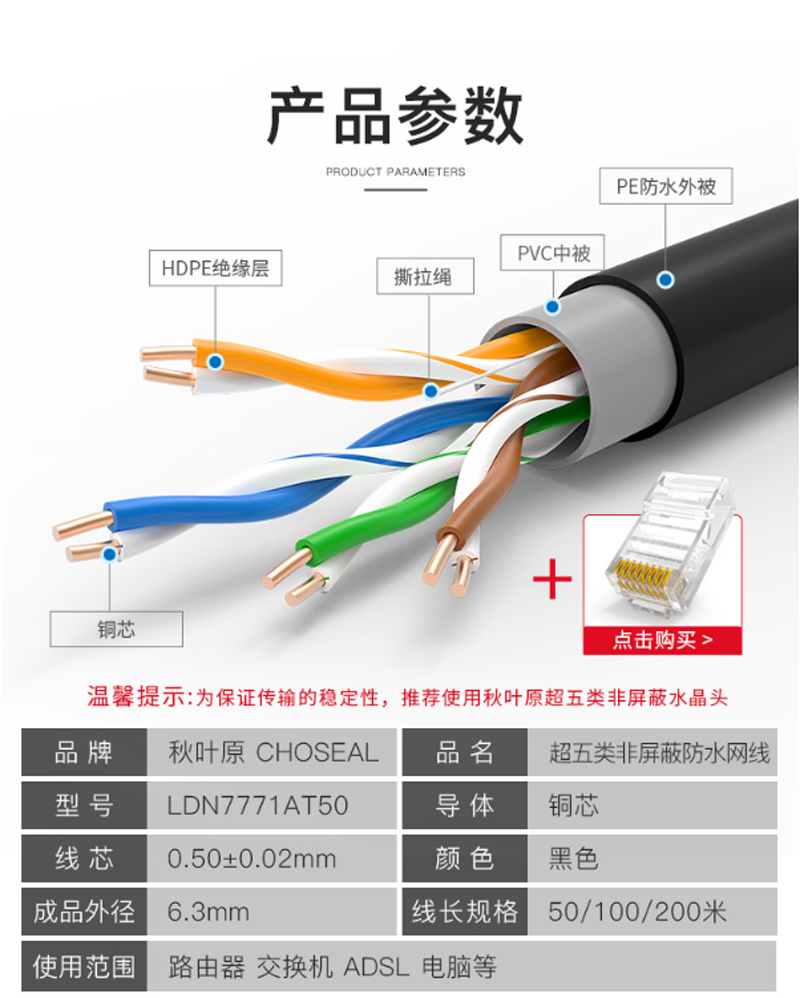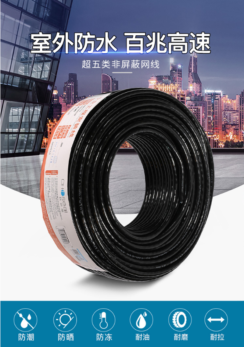 商品名称:☆秋叶原 CHOSEAL 超五类网线 非屏蔽 防水抗晒耐寒 高速 国标纯铜 室外专用网线 黑色 100米 LDN7771AT100