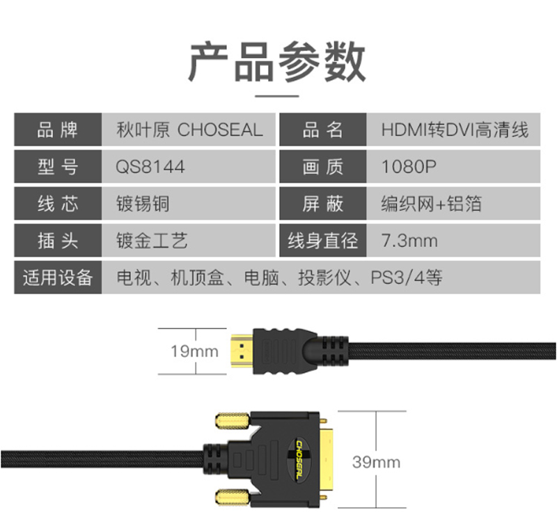 商品名称:☆秋叶原 CHOSEAL QS8144T1 HDMI转DVI高清双向转换连接线 数字高清连接线 1米