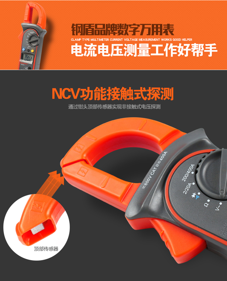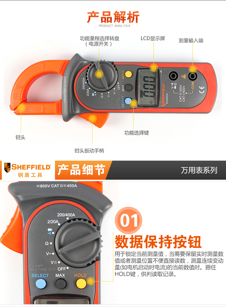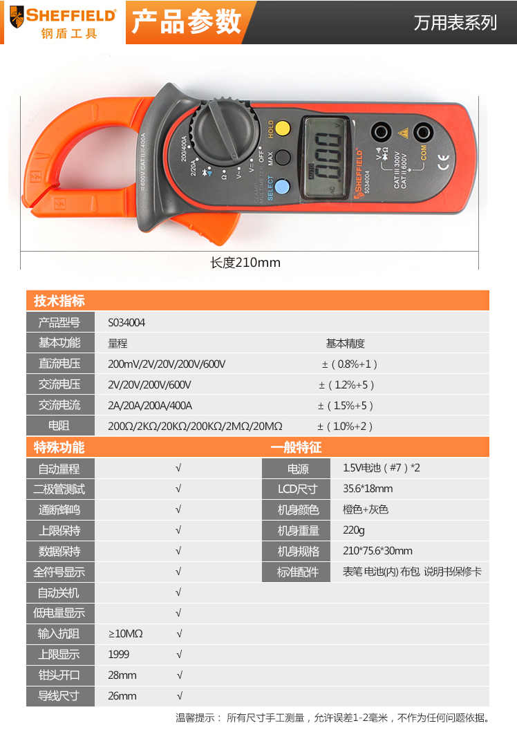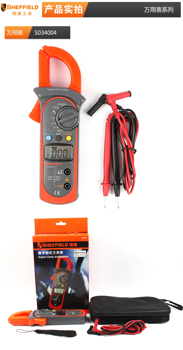 商品名称:SHEFFIELD/钢盾 万用表钳形万用表数显式自动量程高精度自动关机 S034004