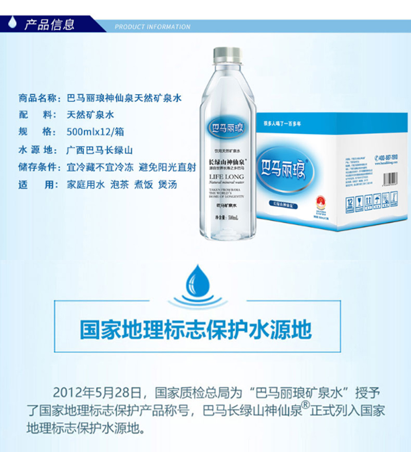 商品名称:☆巴马丽琅 长绿山神仙泉天然矿泉水 商务泡茶饮用水 500ML*12 礼盒装