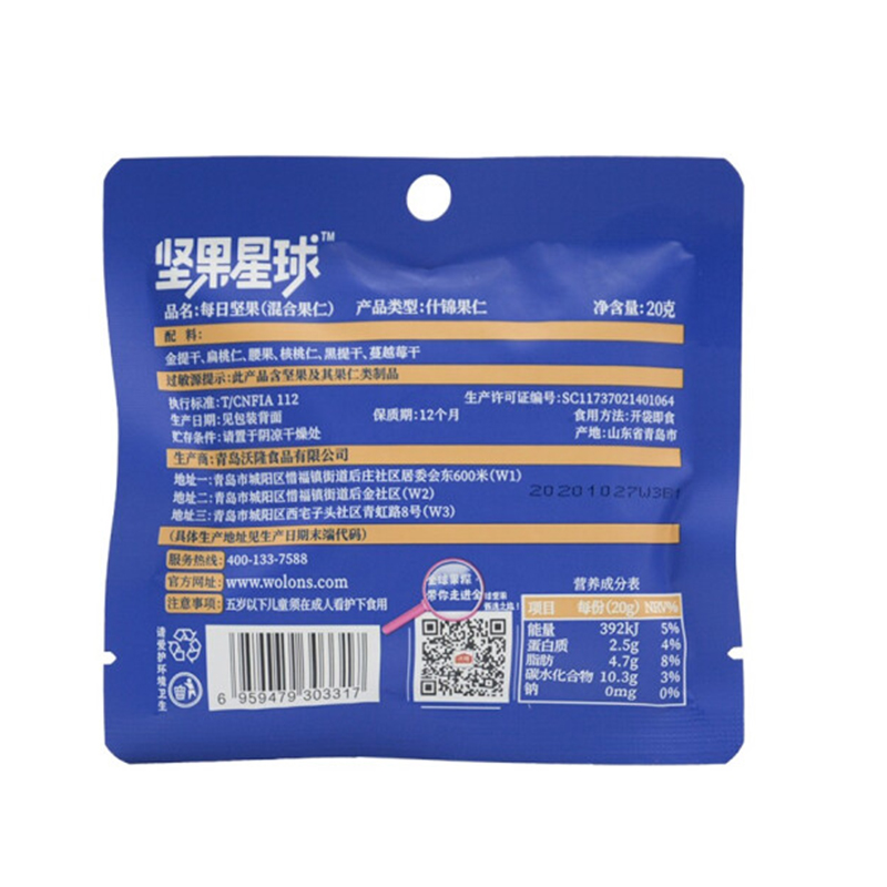 商品名称:沃隆 坚果星球每日坚果 20g*30 袋(单位:袋)