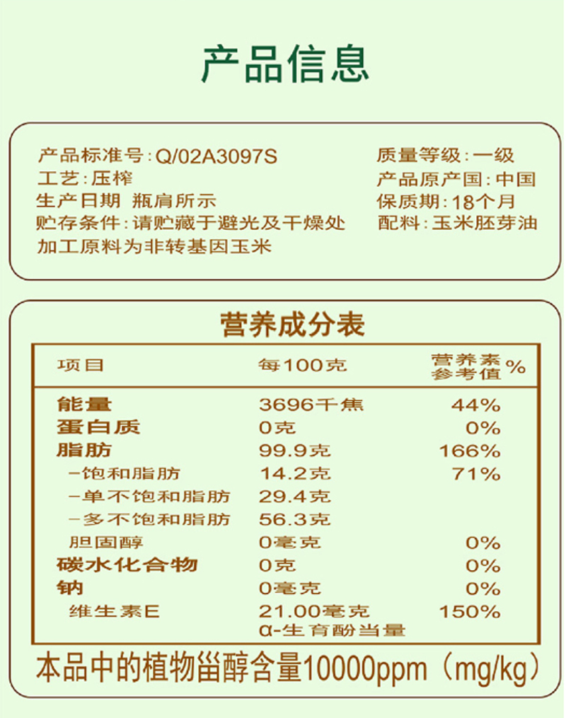 商品名称:福临门-非转基因玉米胚芽油-1.8L-单位:瓶