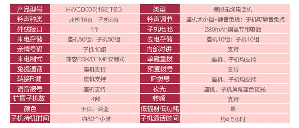 商品名称:步步高 无线座机固定电话子母机 HWCD007(163)TSD