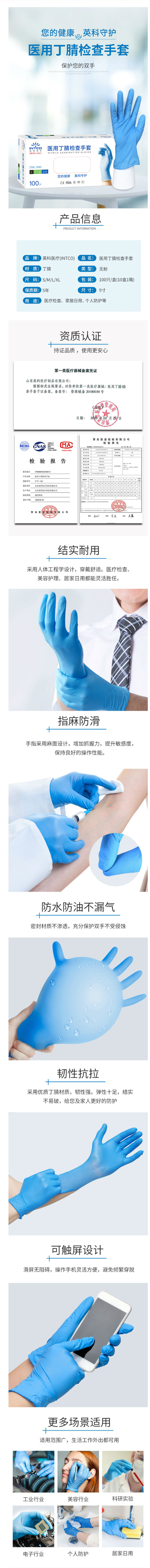 商品名称:英科医疗(INTCO)-无粉标准型-一次性医用丁腈检查手套-蓝色-M码(100只/盒)-单位:盒-起订量10盒