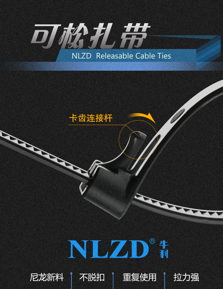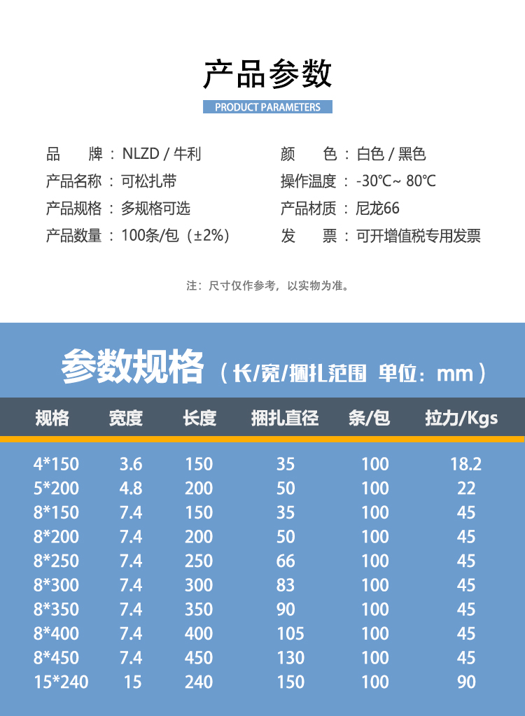 商品名称:牛利 8*450可拆松扎带 尼龙卡扣可反复多次使用 理线固定塑料活扣束带