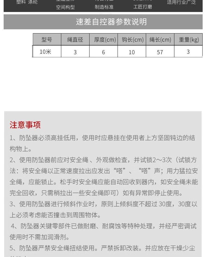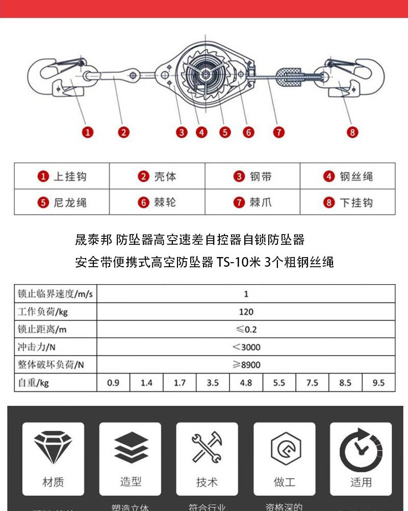 商品名称:晟泰邦 防坠器高空速差自控器自锁防坠器安全带便携式高空防坠器 TS-10米 3个粗钢丝绳