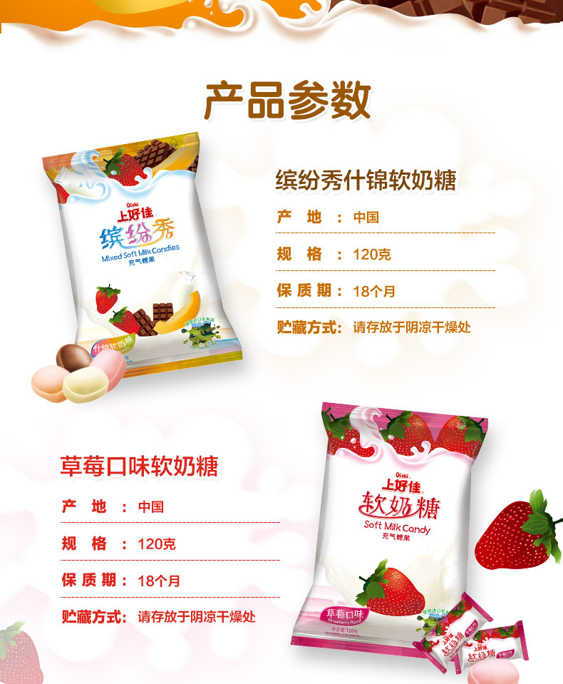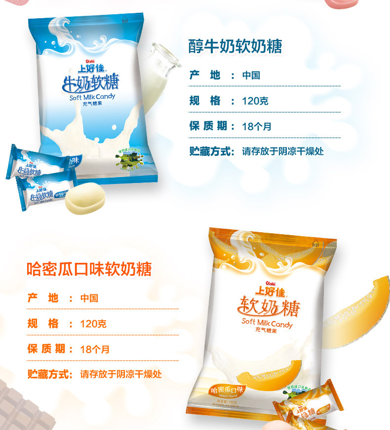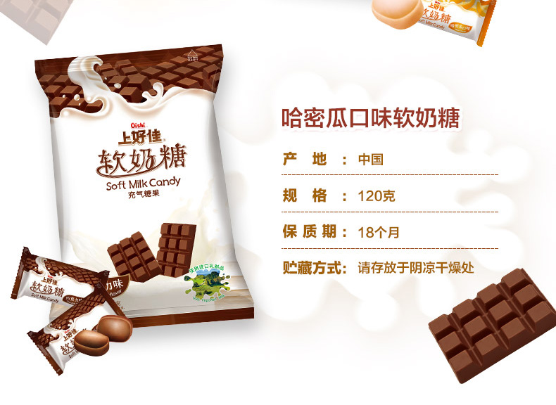 商品名称:上好佳 软奶糖120g/袋草莓牛奶哈密瓜巧克力4种口味