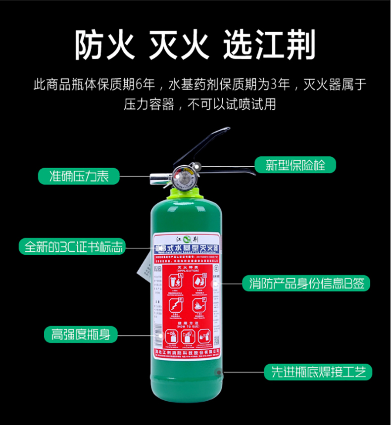 商品名称:江荆 手提式水基型灭火器3升 零下20℃ 可用 车载家用及商用灭火器MSZ/3-NH