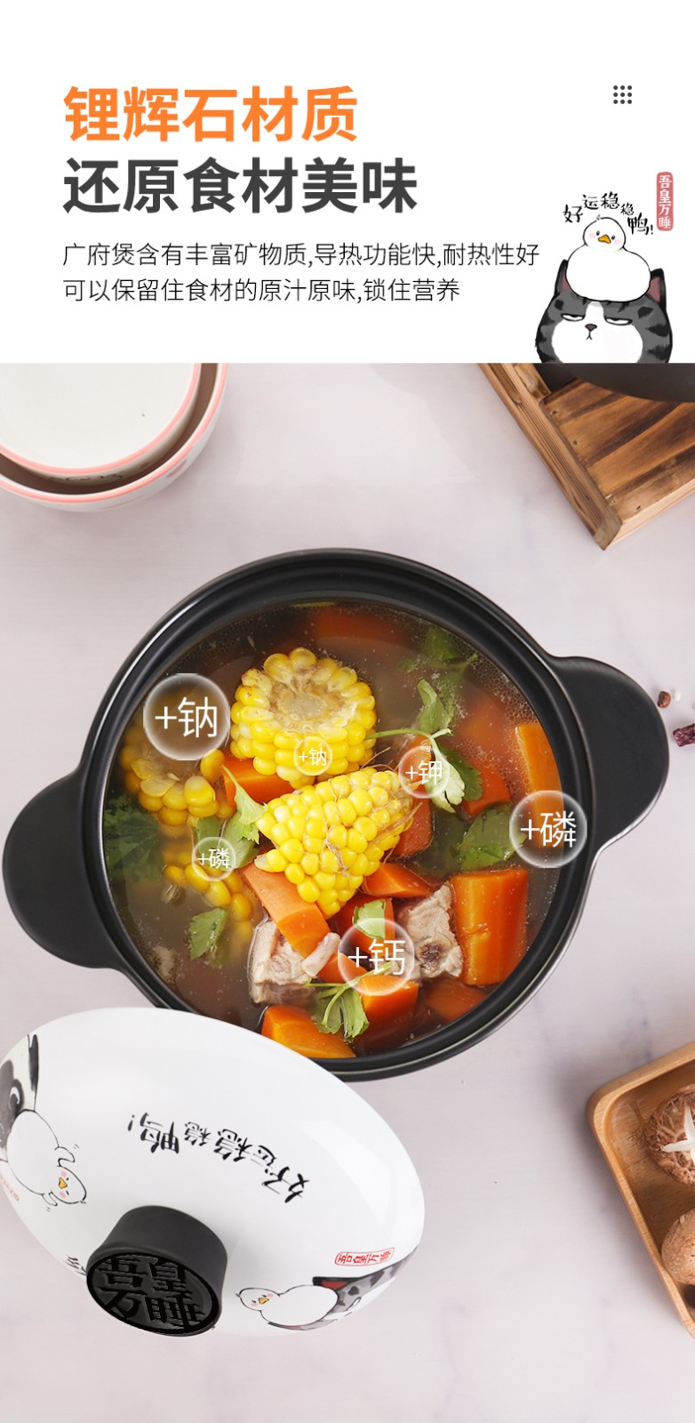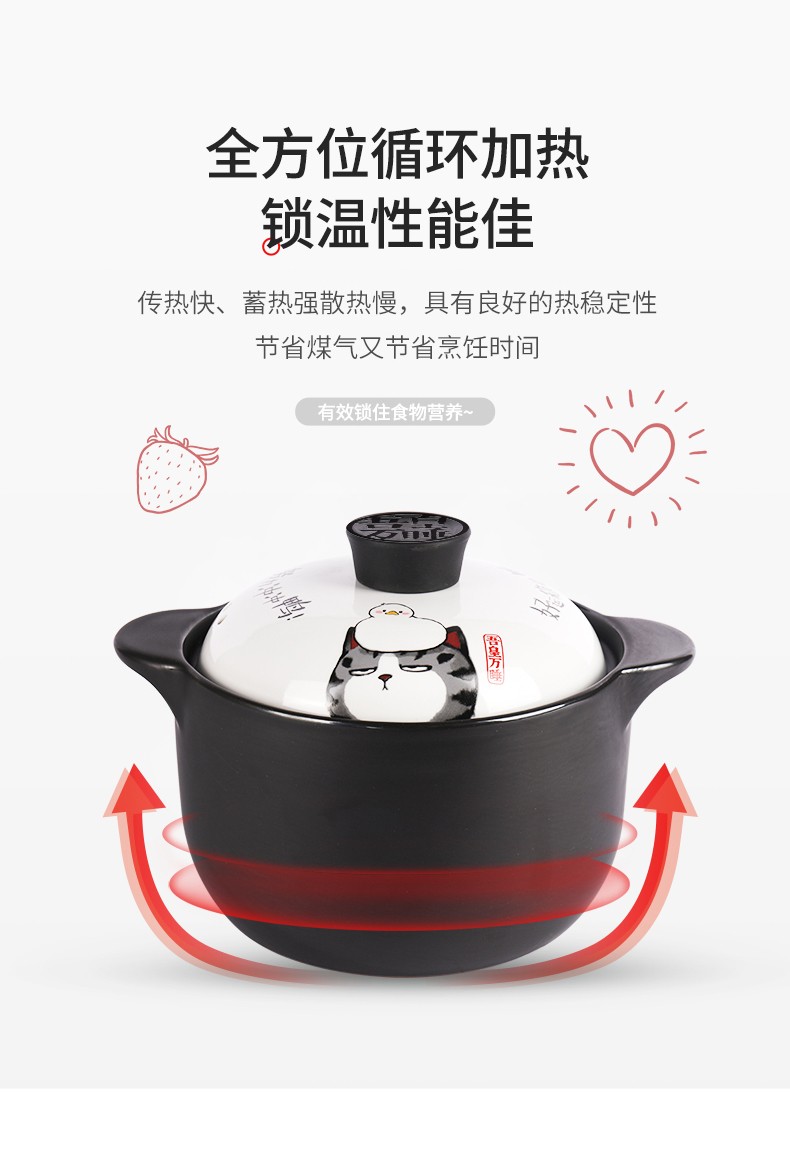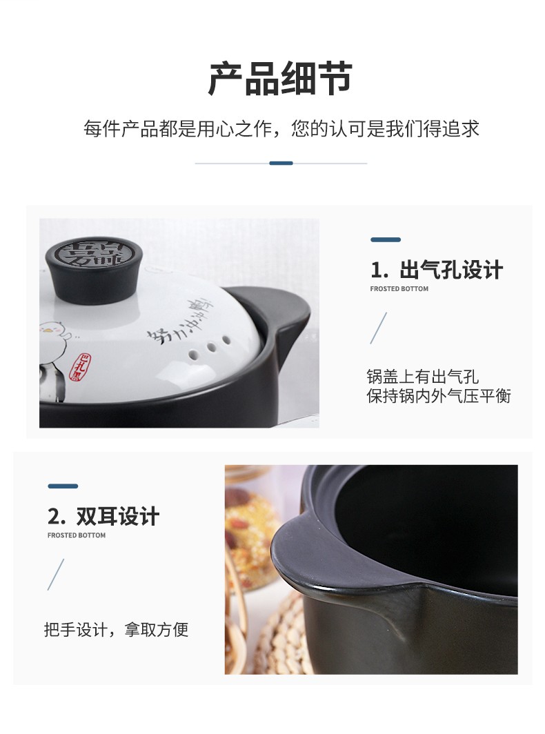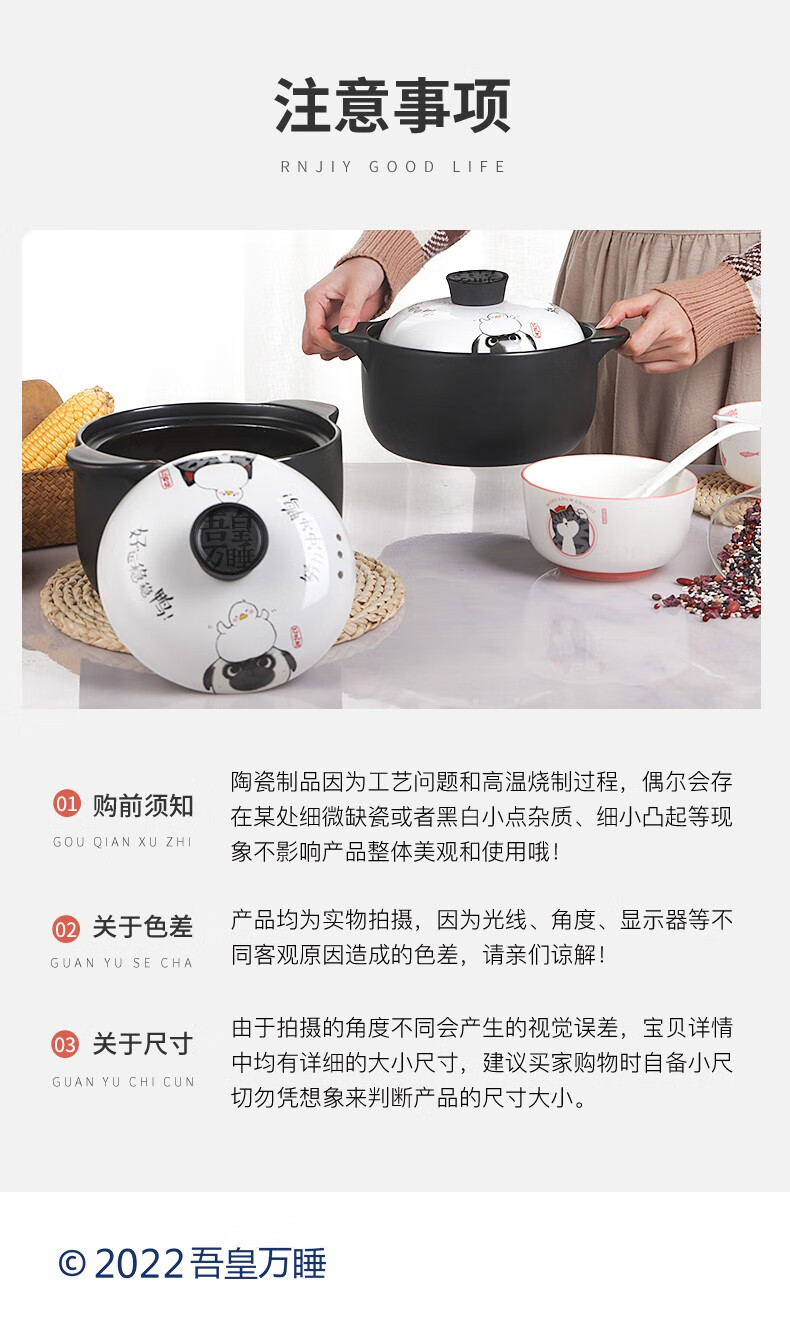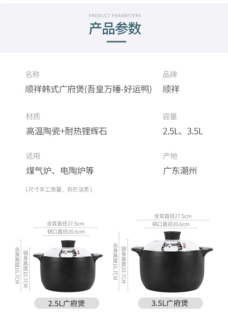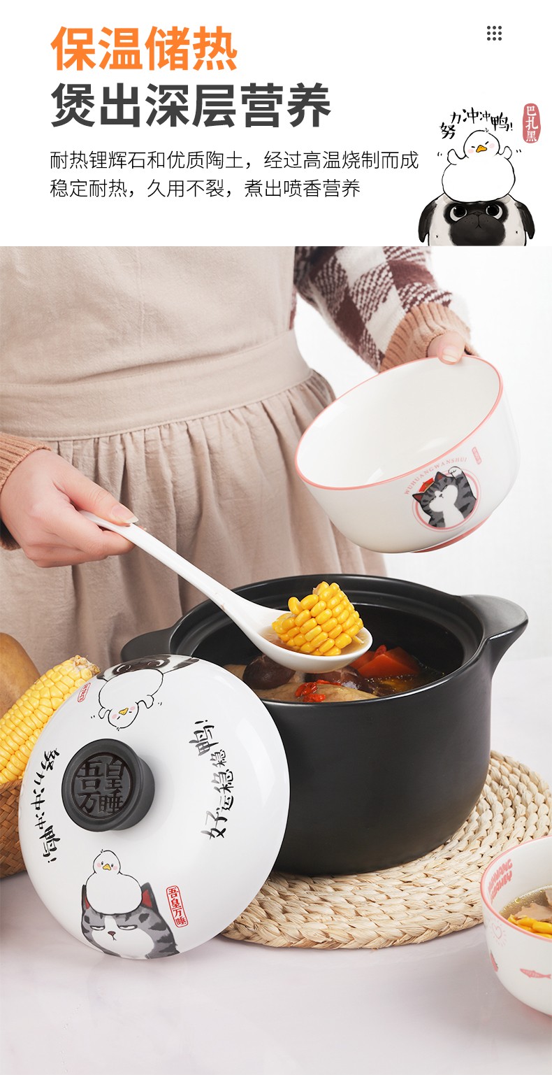 商品名称:顺祥 火锅 砂锅 陶瓷煲汤锅 小炖锅 家用燃气沙锅石锅 明火耐高温煎炒熬药砂锅 菜锅 吾皇万睡-好运鸭 3.5L 单位:个