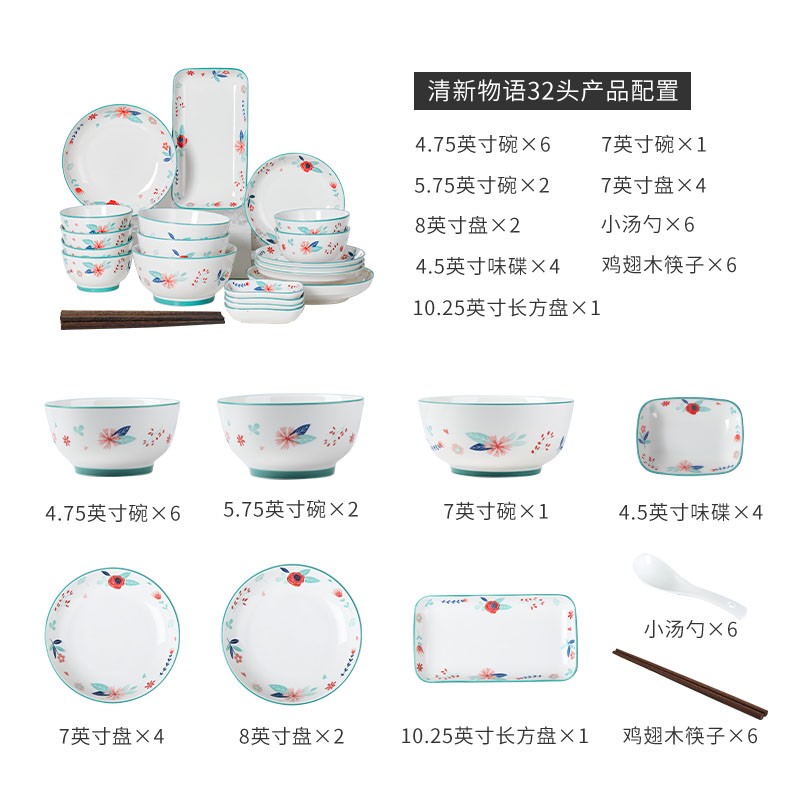 商品名称:顺祥 碗碟套装陶瓷餐具保鲜乔迁礼物婚庆彩礼盒釉下彩耐高温可微波简约鱼盘子筷勺味碟 清新物语32头 单位:盒