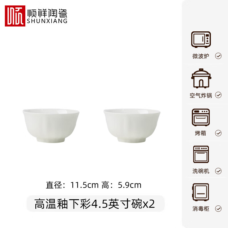 商品名称:顺祥陶瓷纯白碗碟套装家用饭碗简约餐具高温釉下彩面碗异形碗盘子 【2个】4.5英寸饭碗 单位:组