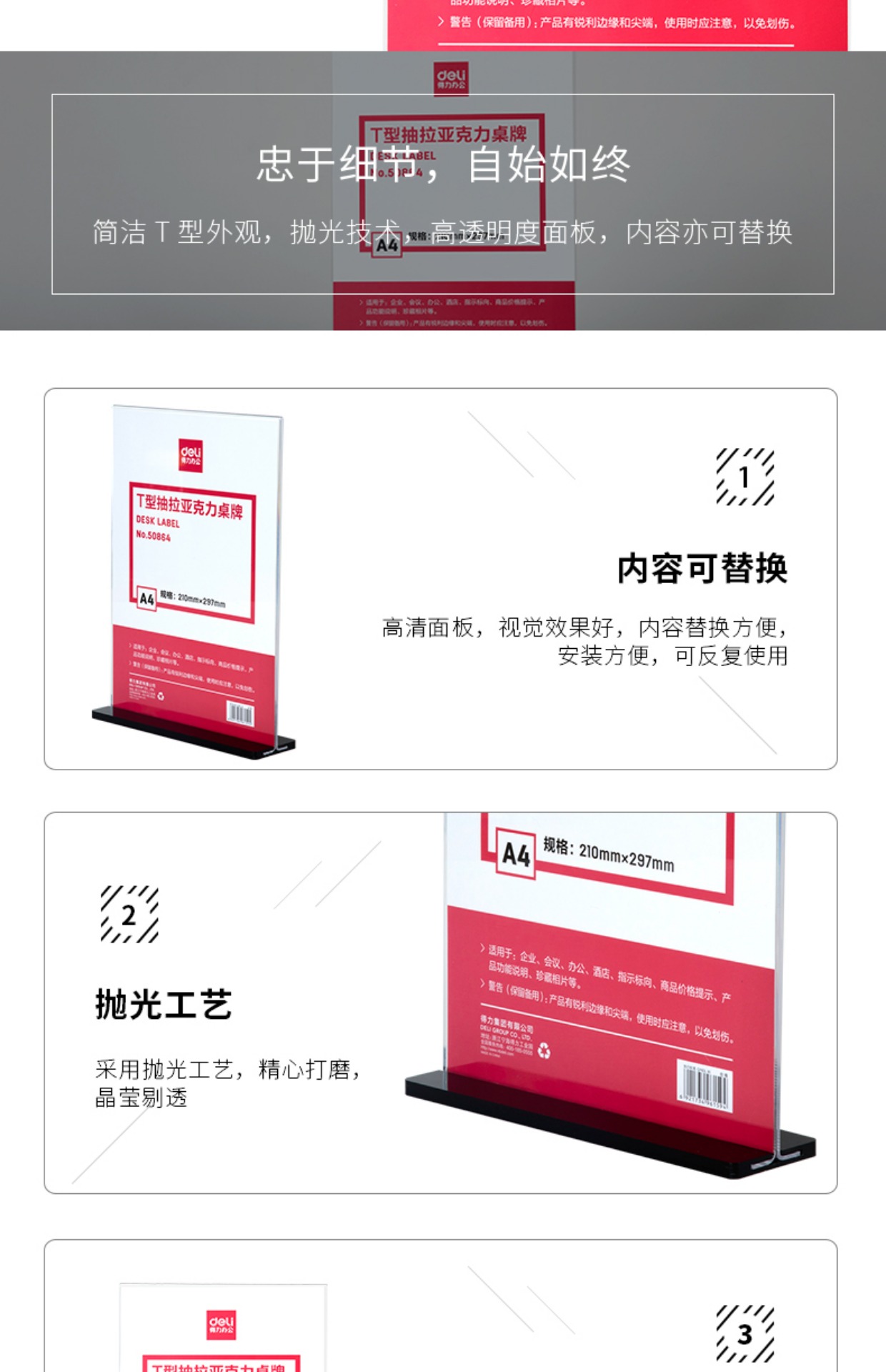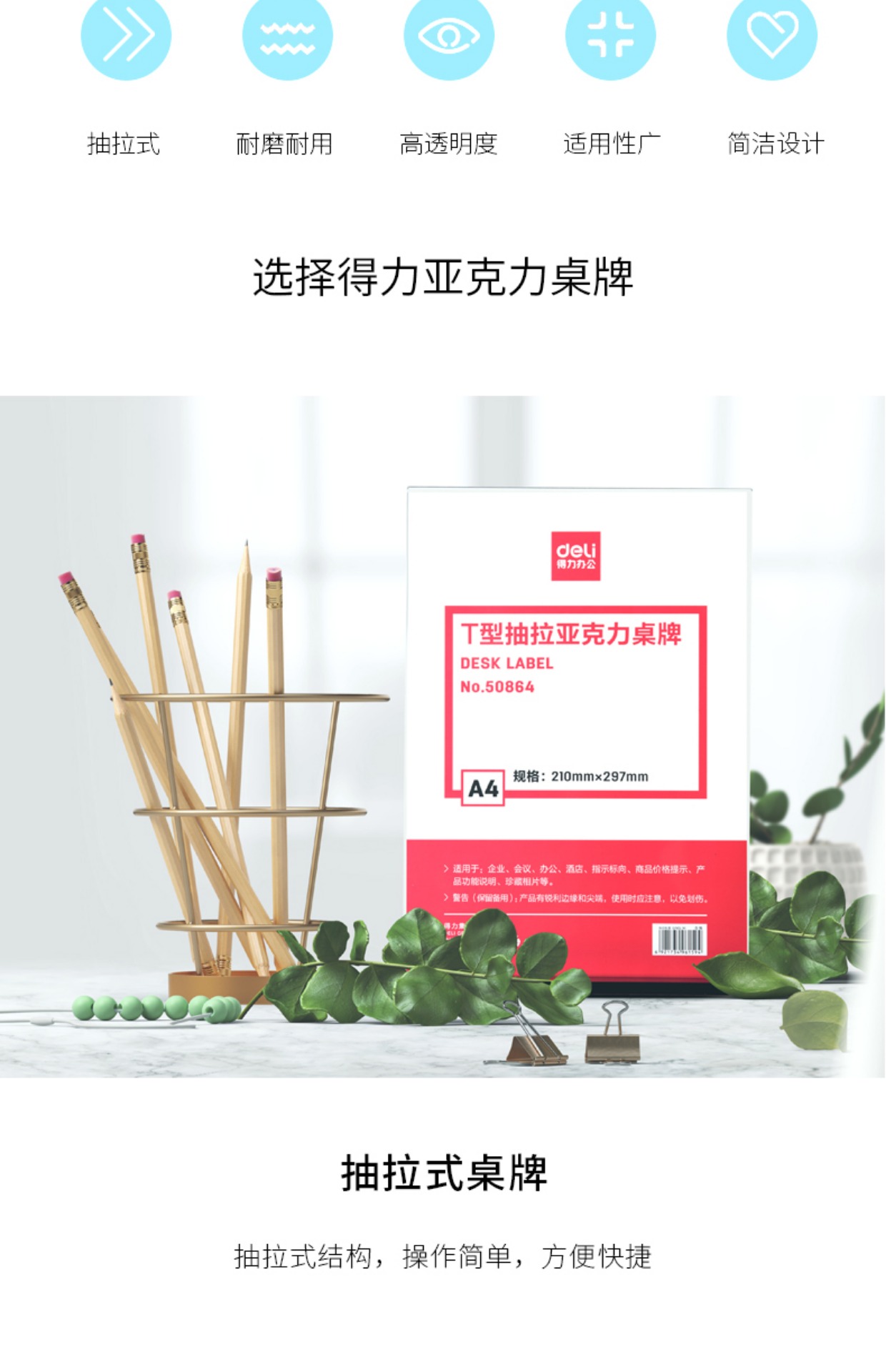 商品名称:得力 T型抽拉亚克力桌牌展示牌桌面立式A4竖式双面广告台卡签50864