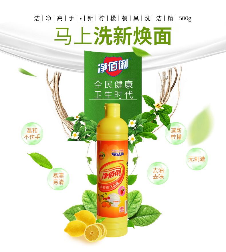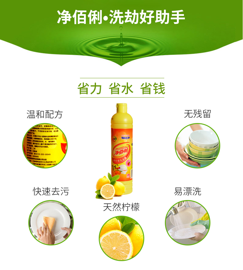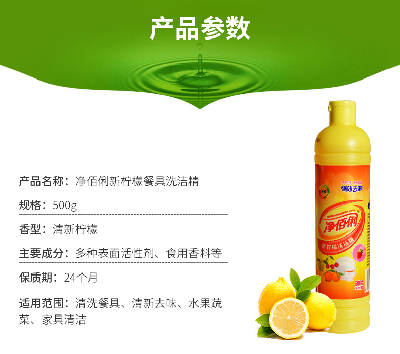 商品名称:净佰俐 (JINGBL) 柠檬餐具洗洁精500g*20瓶/箱 去油不伤手 食品用工业(新老包装随机)