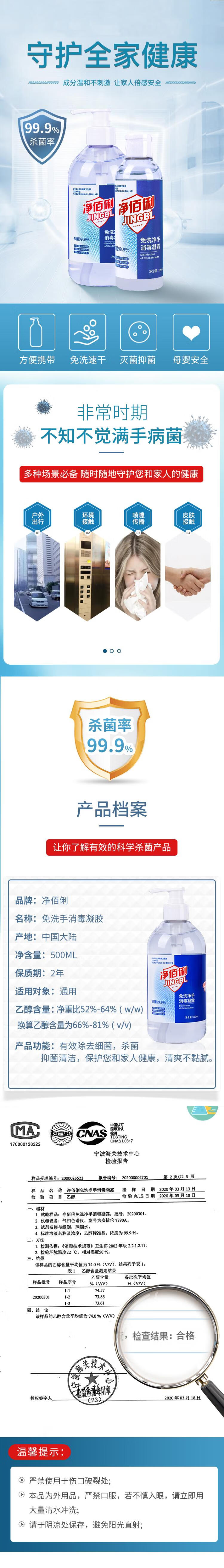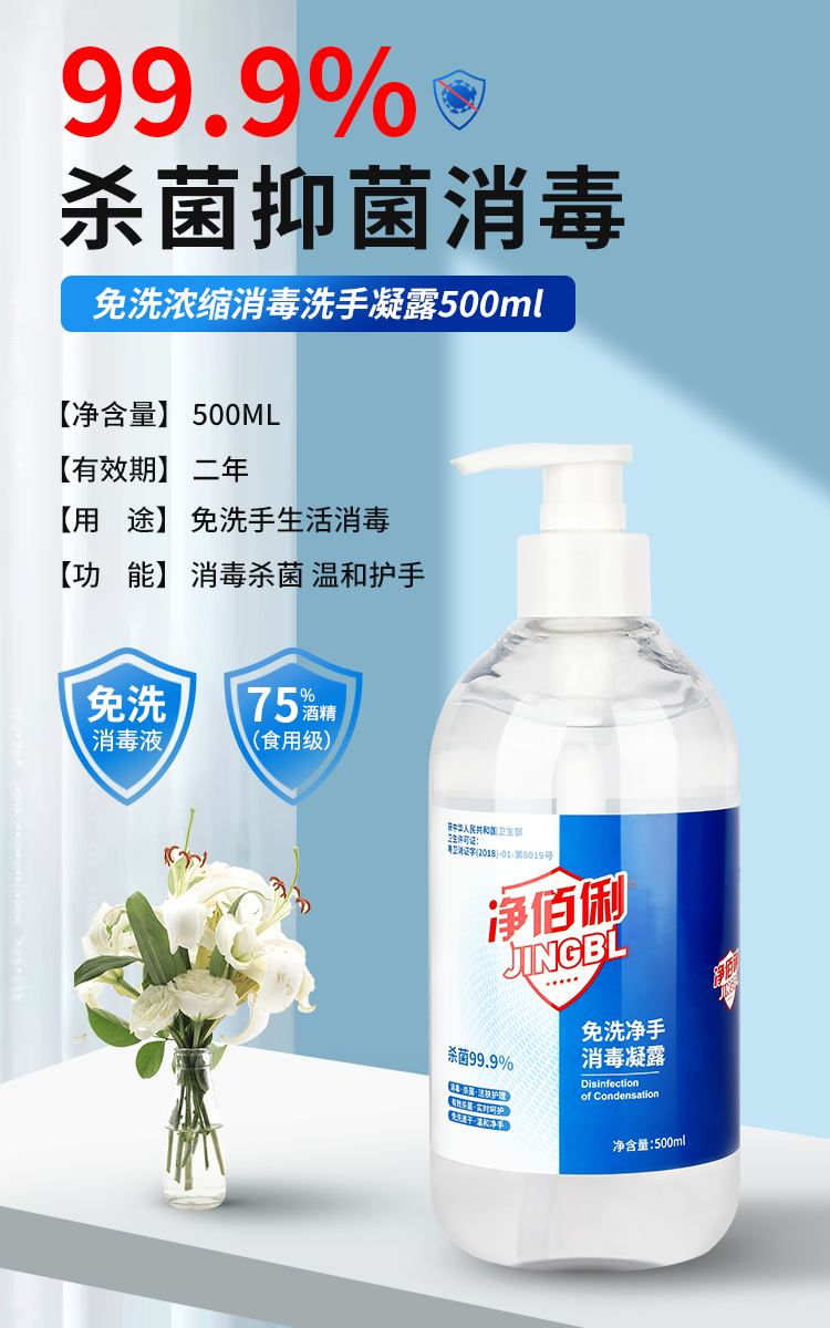 商品名称:净佰俐 (JINGBL) 乙醇免洗手消毒凝露500ml*24瓶 含75%酒精消毒企业工业品(新老包装随机)单位:箱