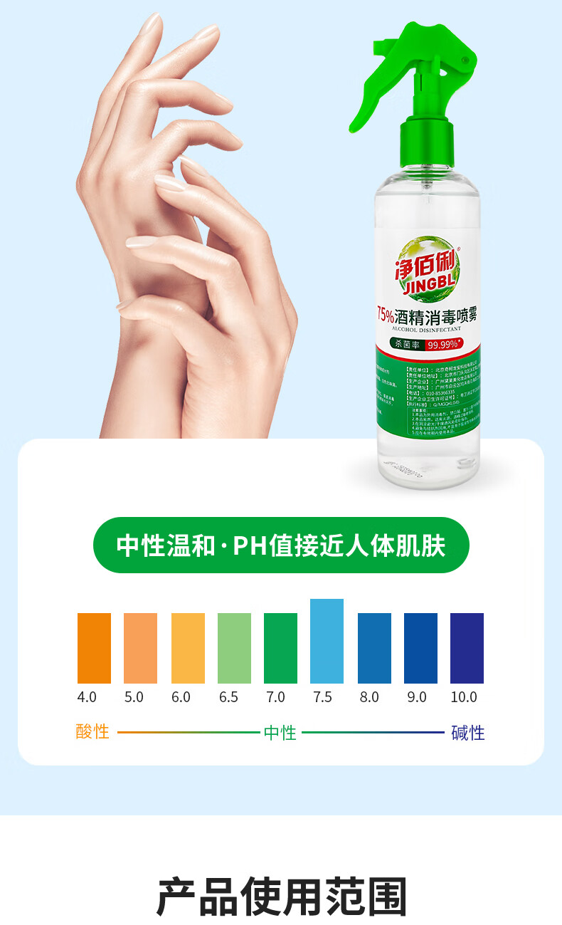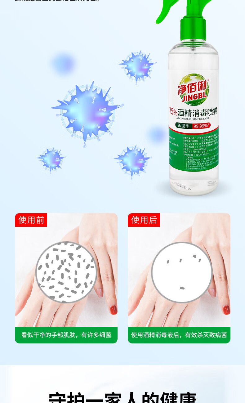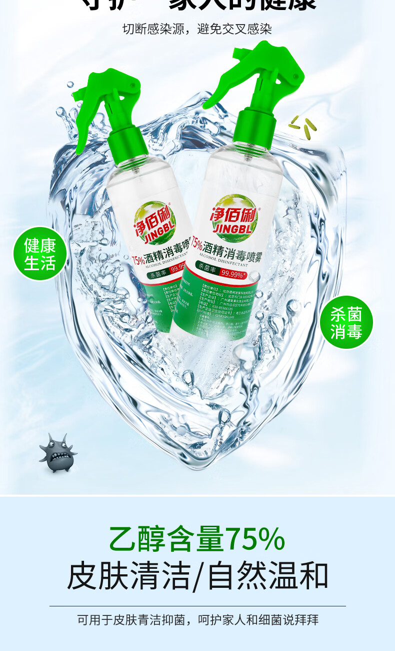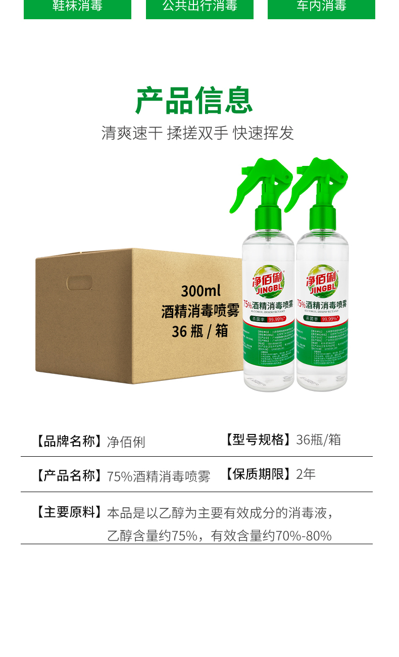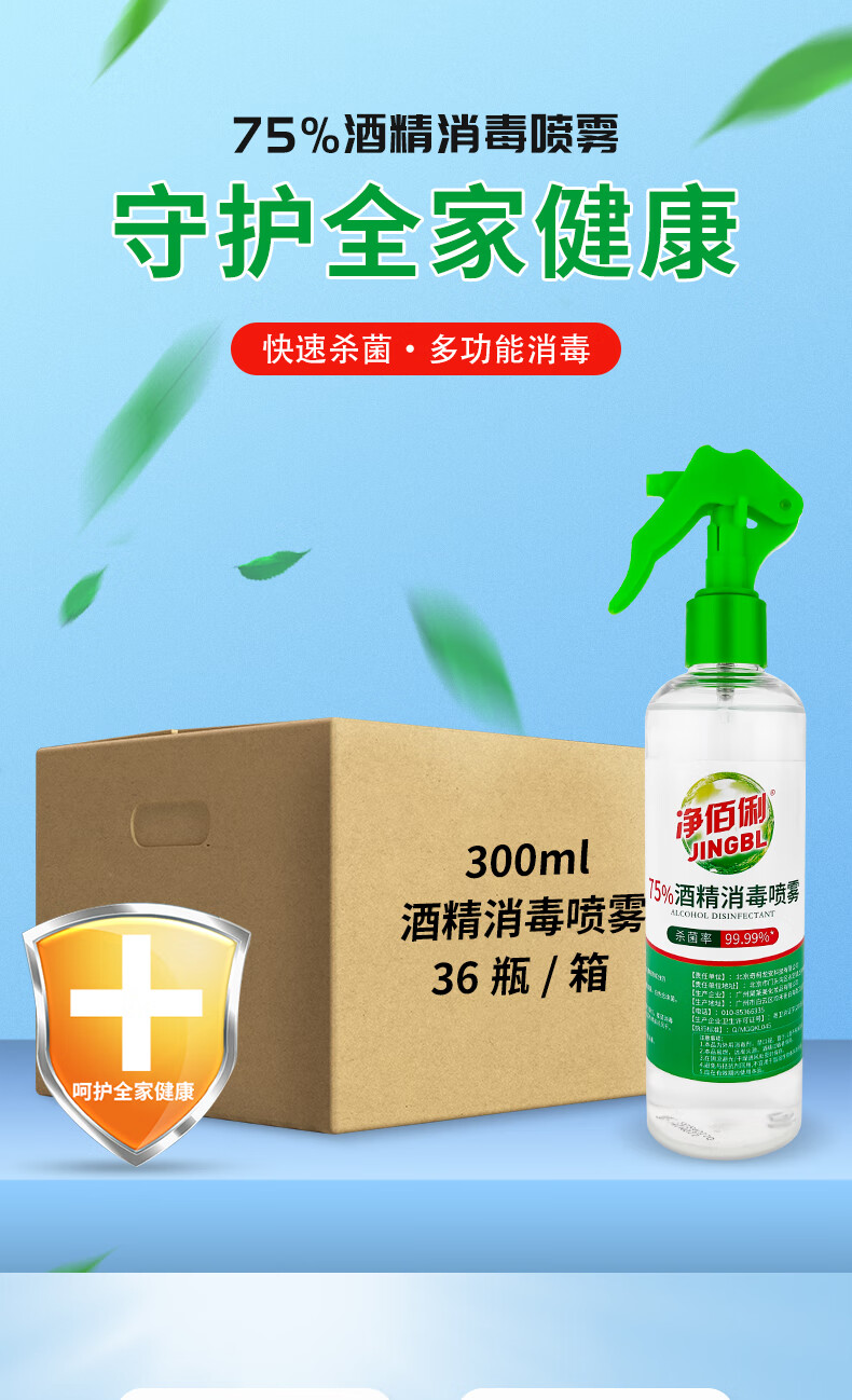 商品名称:净佰俐 (JINGBL) 75%酒精喷雾300ml*36瓶 免洗手酒精消毒液剂乙醇开学居家办公车间杀菌(新老包装随机) 单位:箱