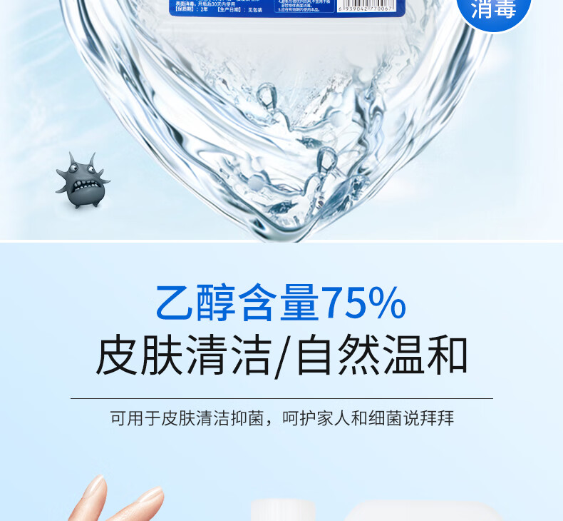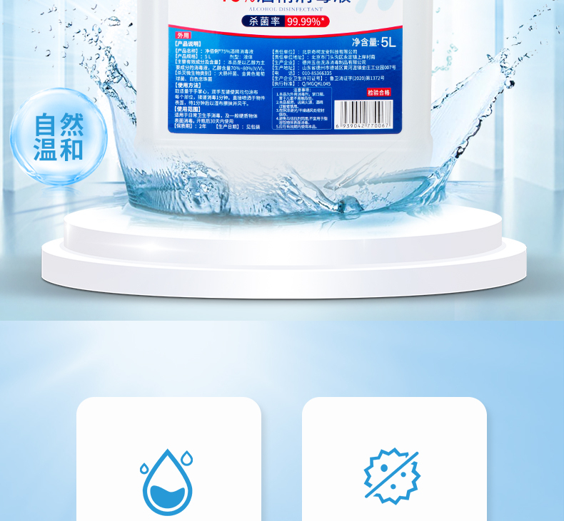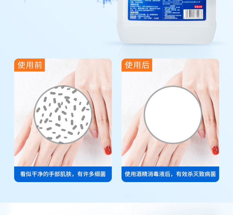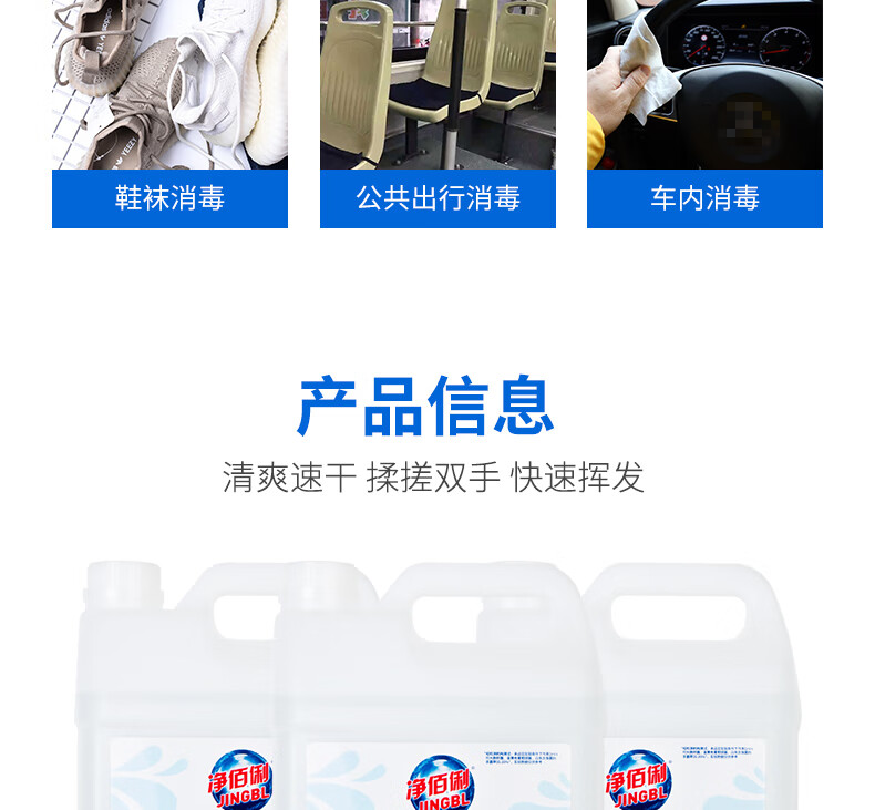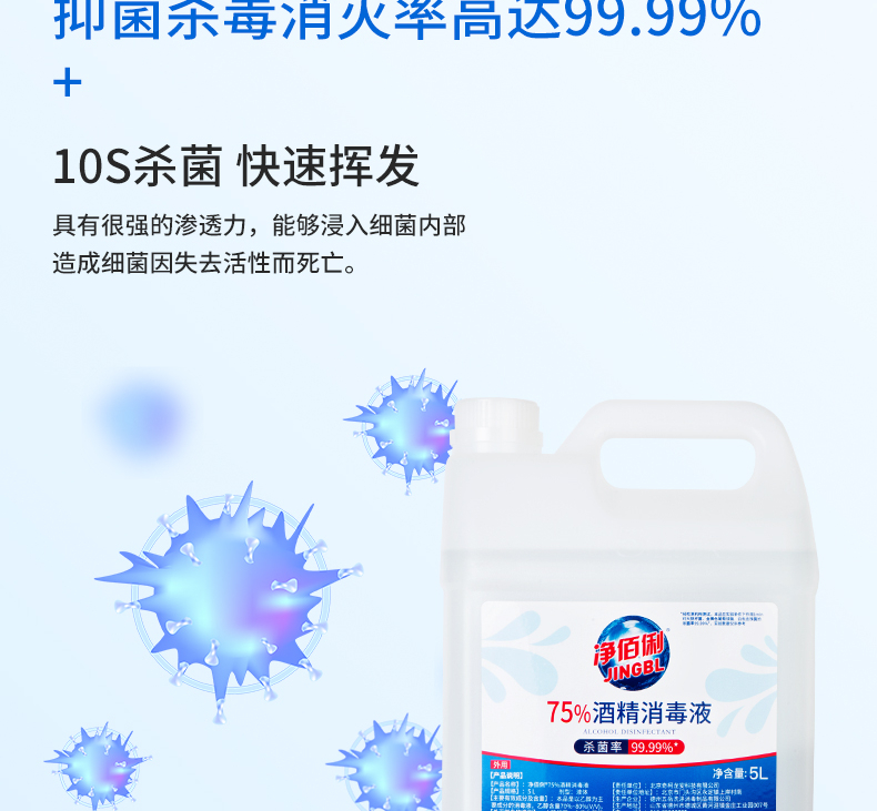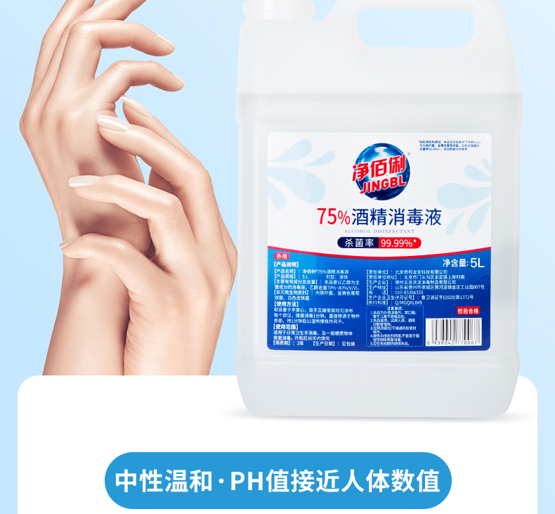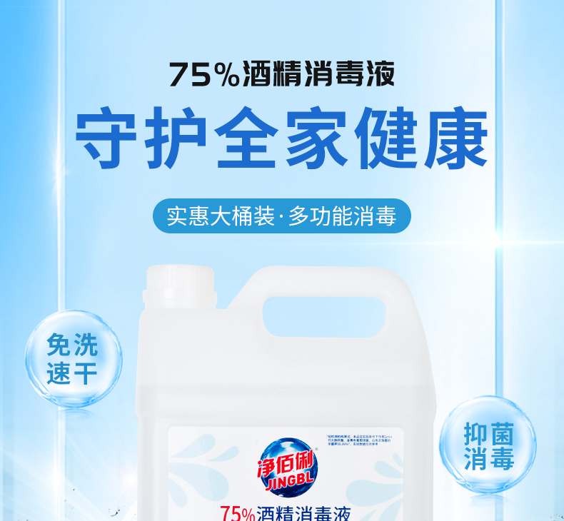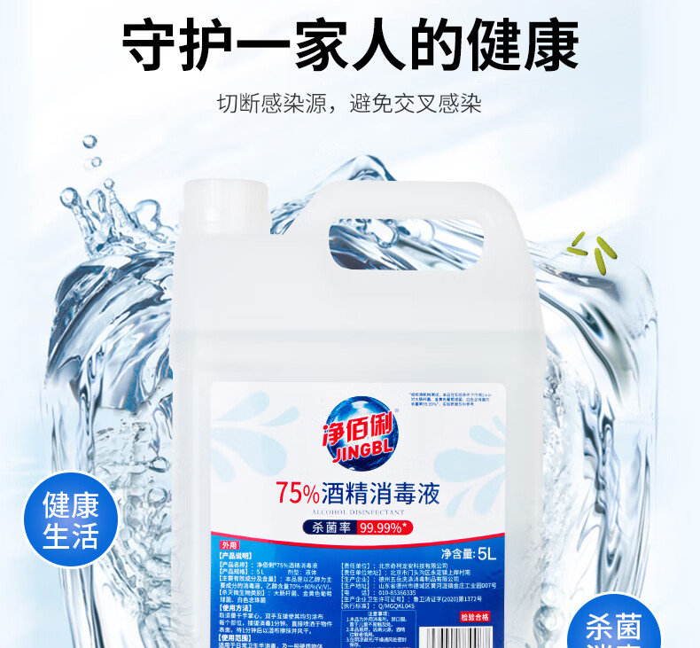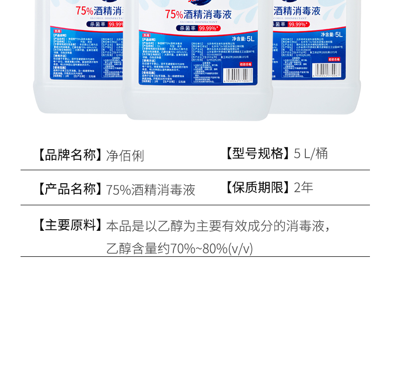 商品名称:净佰俐 (JINGBL) 75%酒精消毒液5L*3桶 酒精喷雾液体 免洗手乙醇消毒液车间杀菌(新老包装随机) 单位:箱